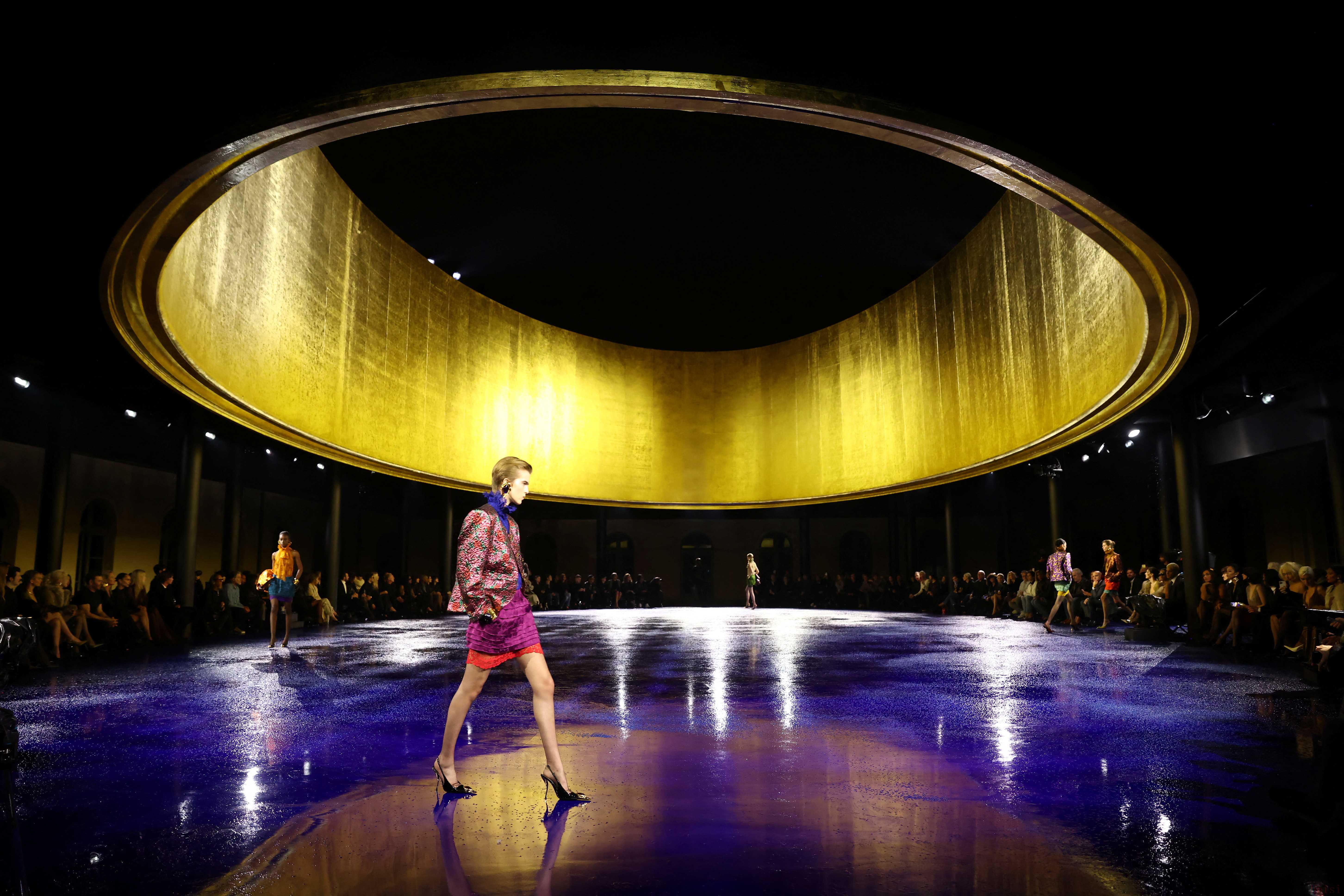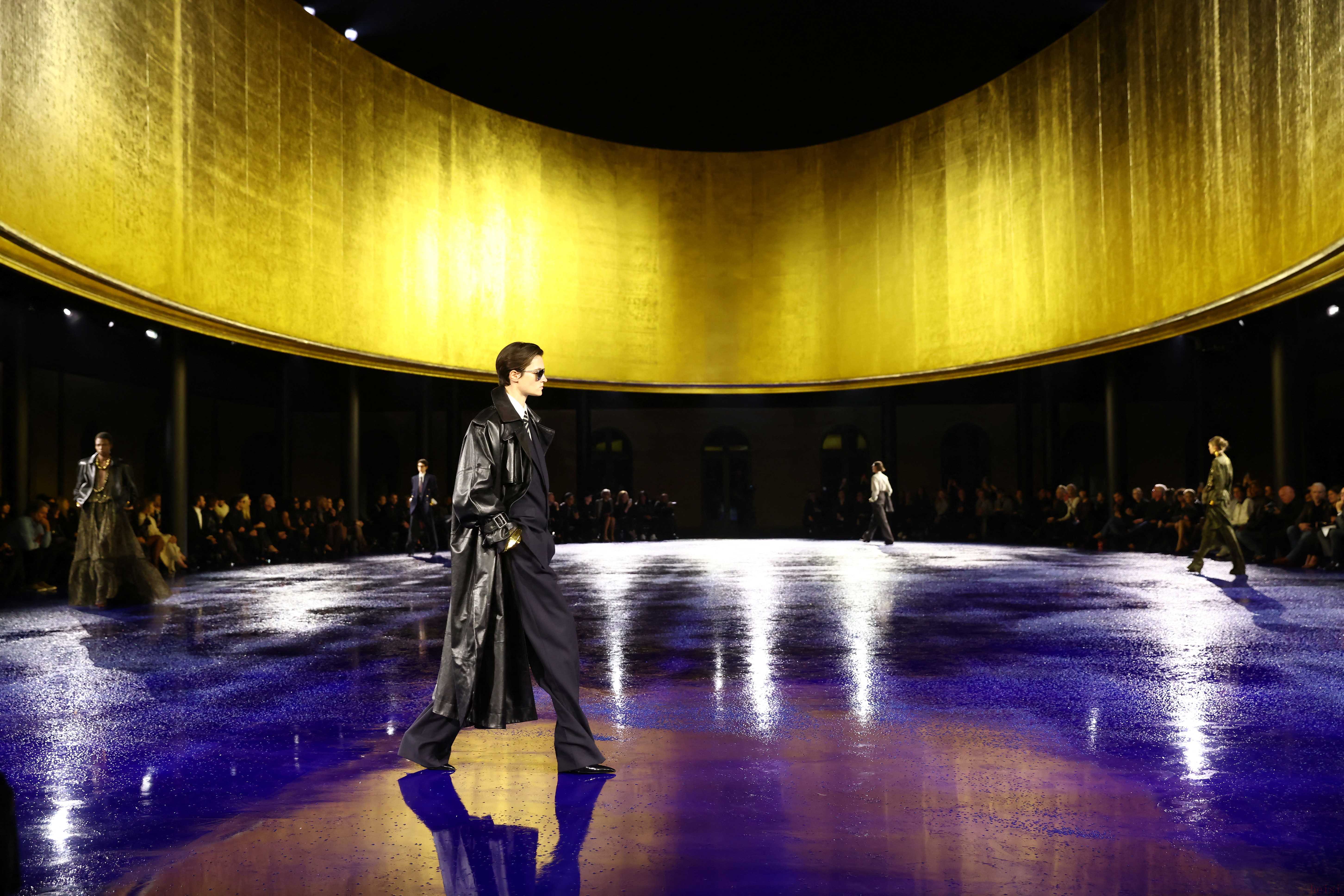 T臺(tái)上的模特身著圣羅蘭品牌最新系列時(shí)裝,展示出獨(dú)特的時(shí)尚魅力。