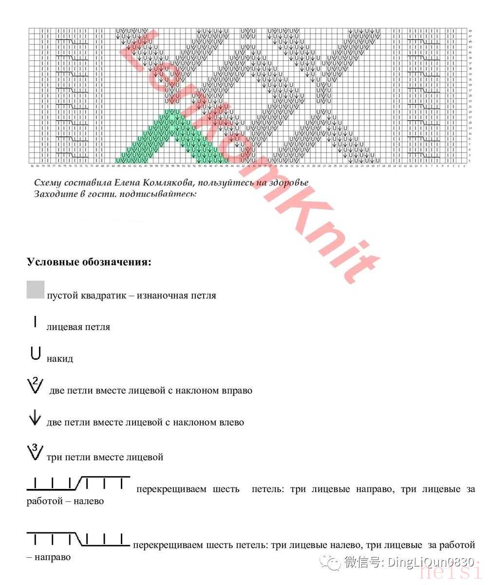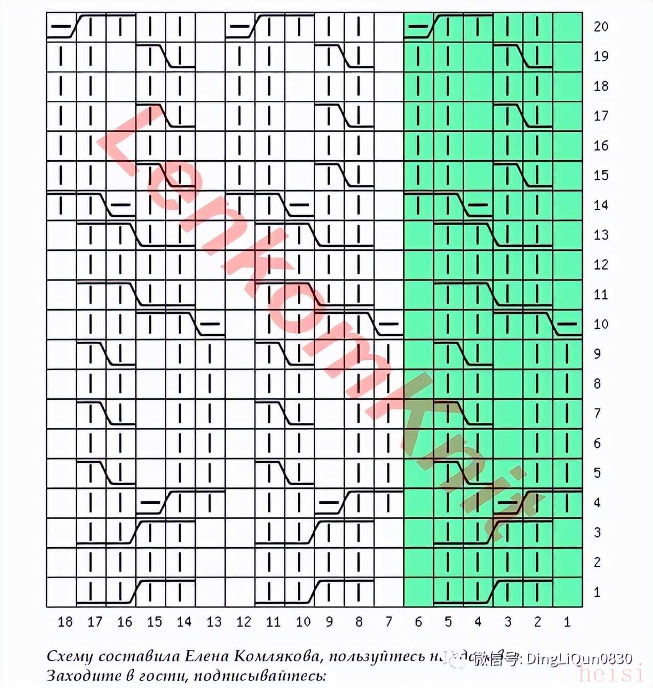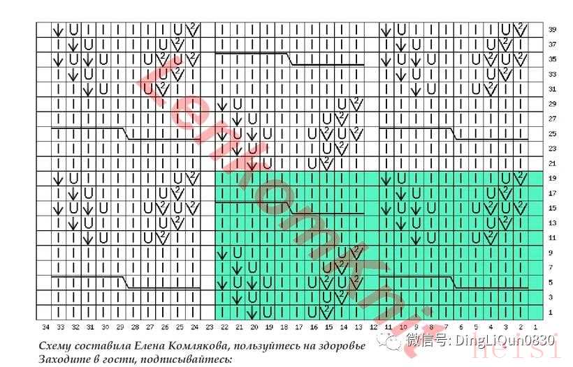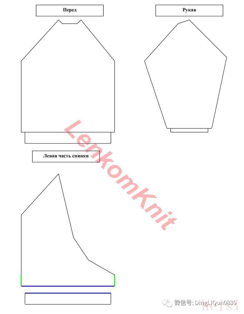 在中心,在寬度和高度上繪制了一個完整的菱形。關(guān)系用綠色標記,用于編織正面的左右兩側(cè)(從圖中的中央圖案開始)和袖子,這些不完全是菱形,而只是一個上半部分。