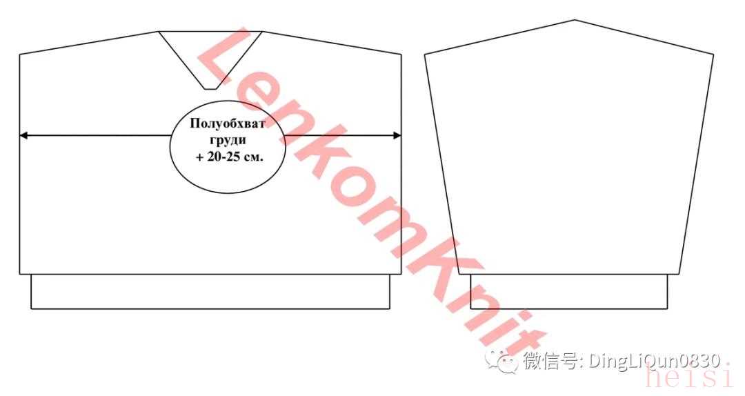 該圖顯示了這個有趣模型的近似模式。毛衣的正面和袖子是規(guī)則的,插肩。背面由兩半編織而成。在圖案上 - 左半邊,右半邊鏡像編織。