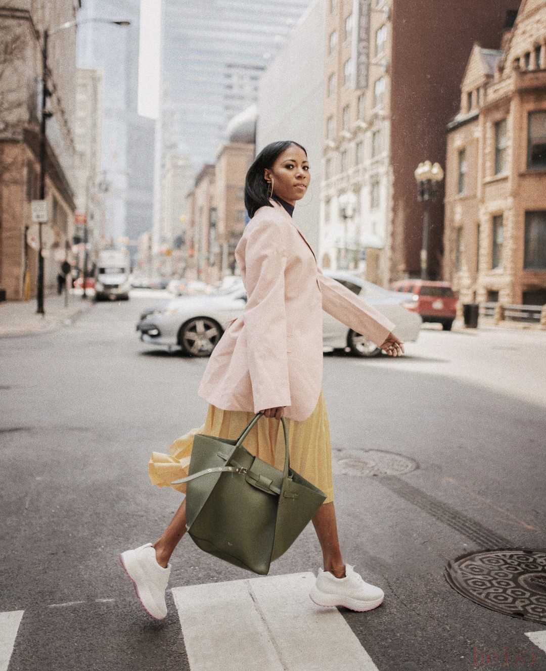 顏色靚麗的挎包駕馭起來并不簡單,如果穿搭不對,整體會給人一種輕浮的感覺。顏色鮮艷的挎包并不是要和穿搭的顏色相呼應才是最好看的,可以試著用基礎色搭配,最后用一個色彩鮮艷的挎包點亮穿搭,這樣的搭配更能讓人印象深刻。
