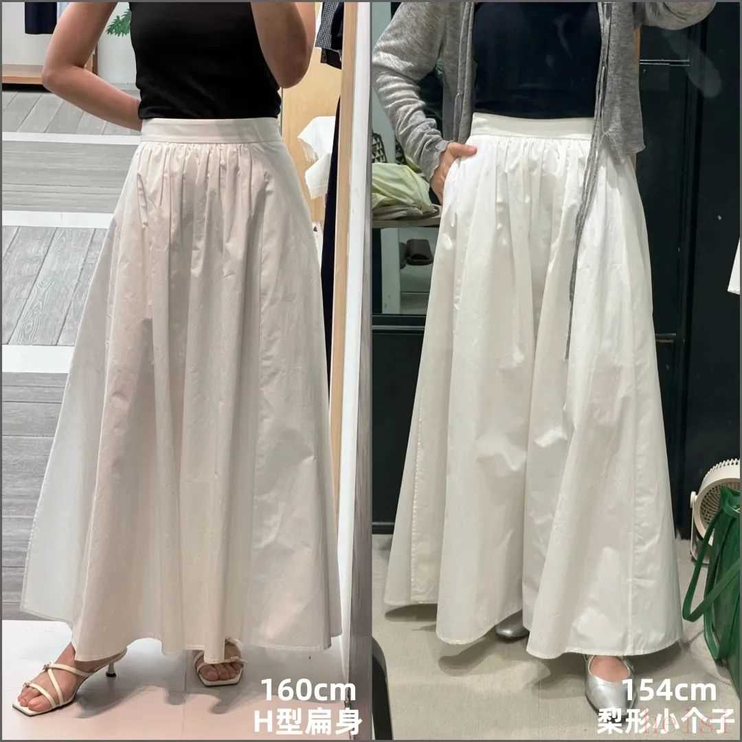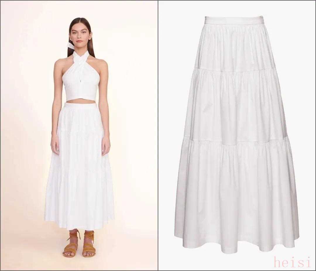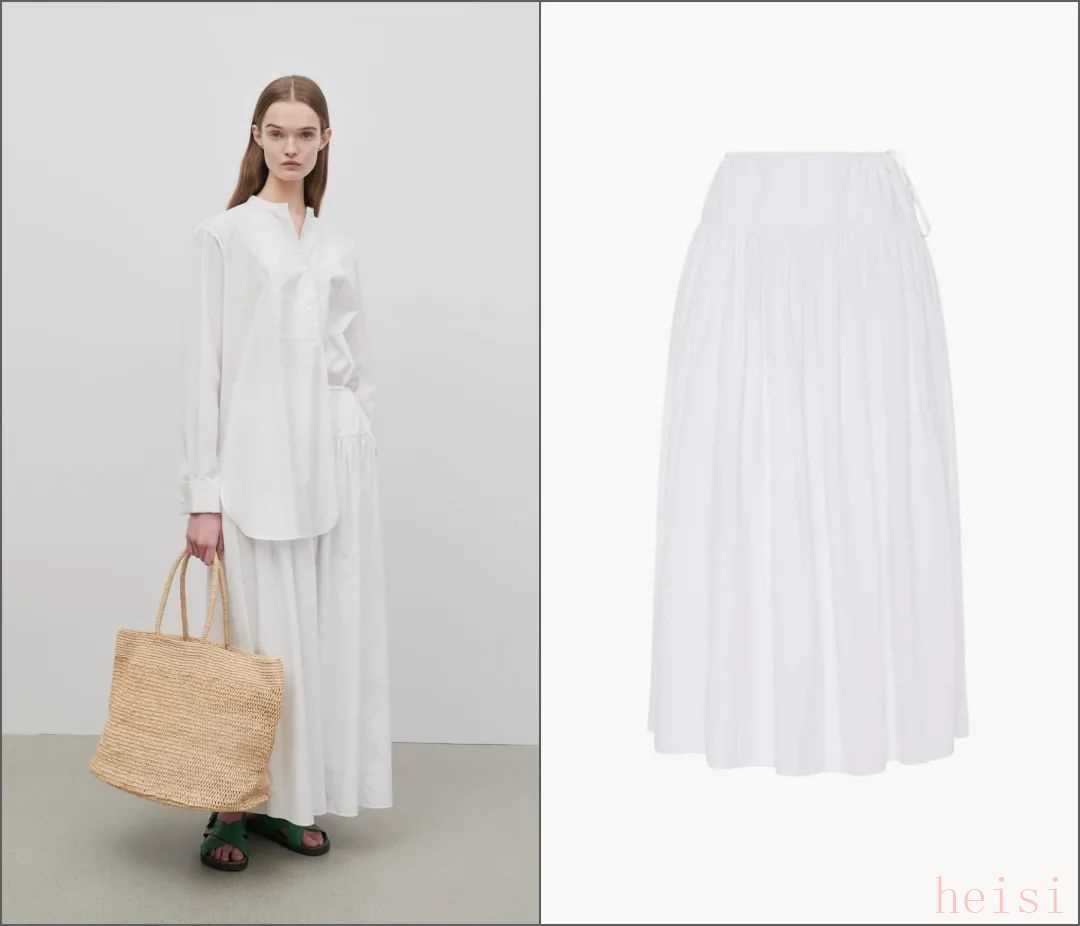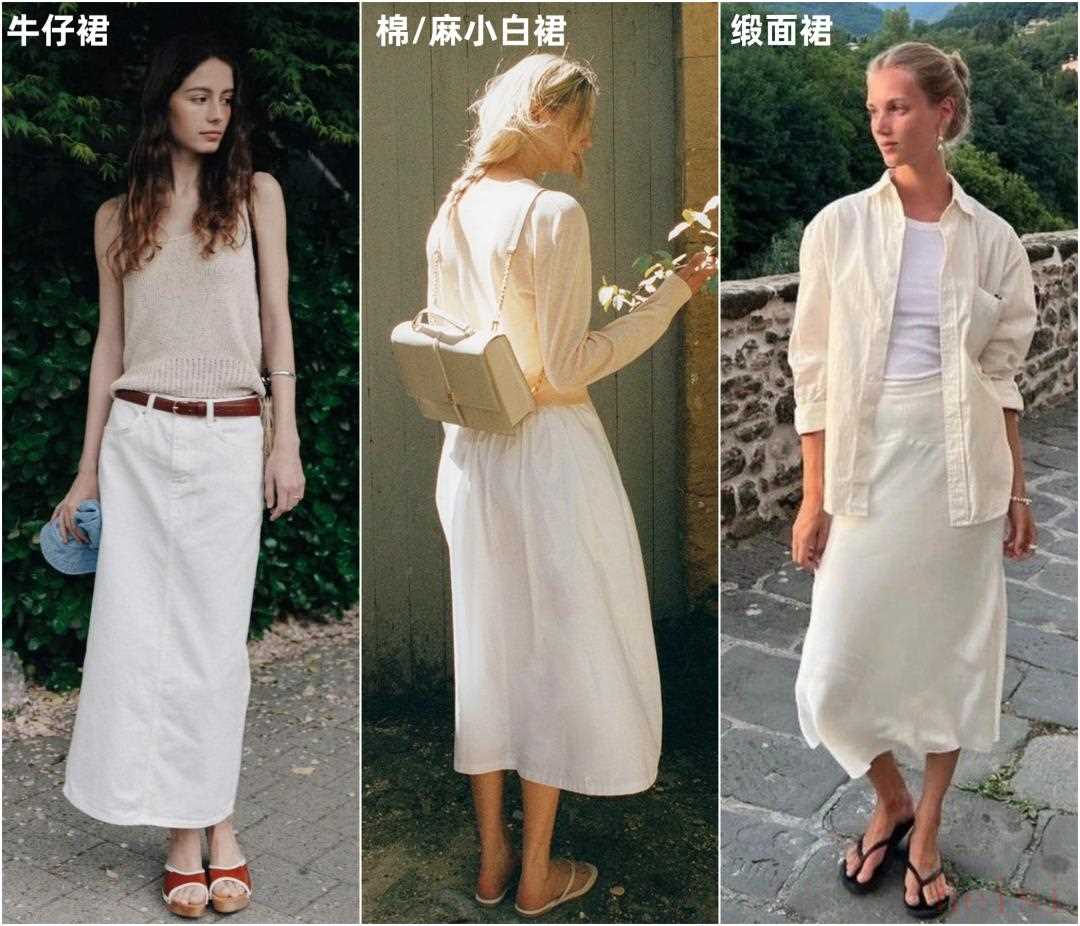 這兩年火的幾乎都是同一種類型,就是下圖中間這條——寬松的小A版型、設(shè)計(jì)簡(jiǎn)約的白色過膝裙,它比牛仔裙輕盈,又比緞面裙更休閑。▼