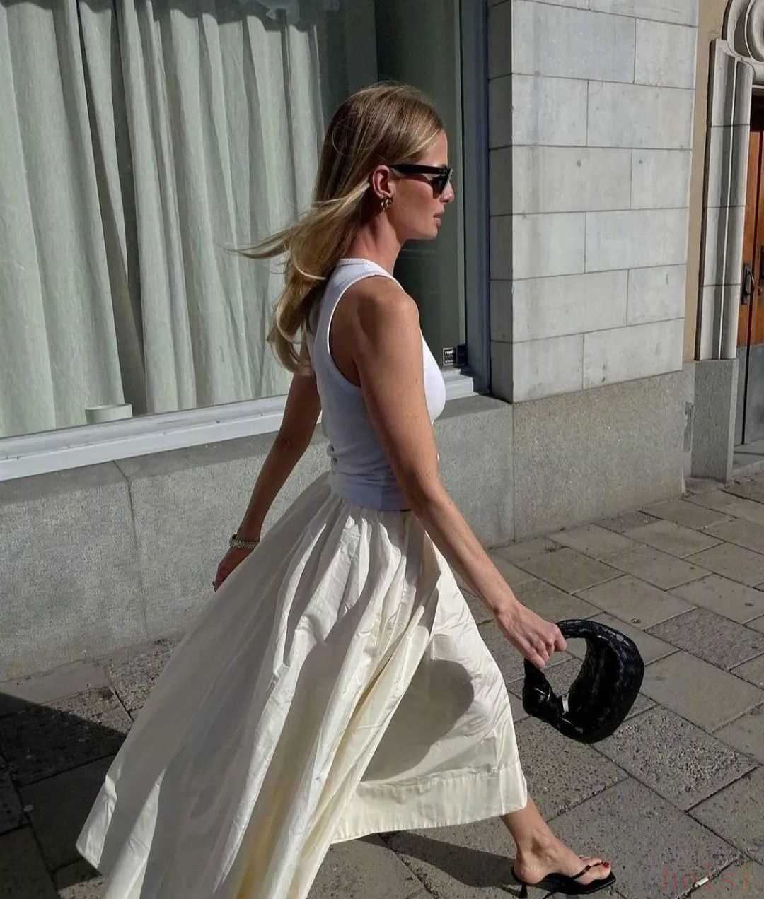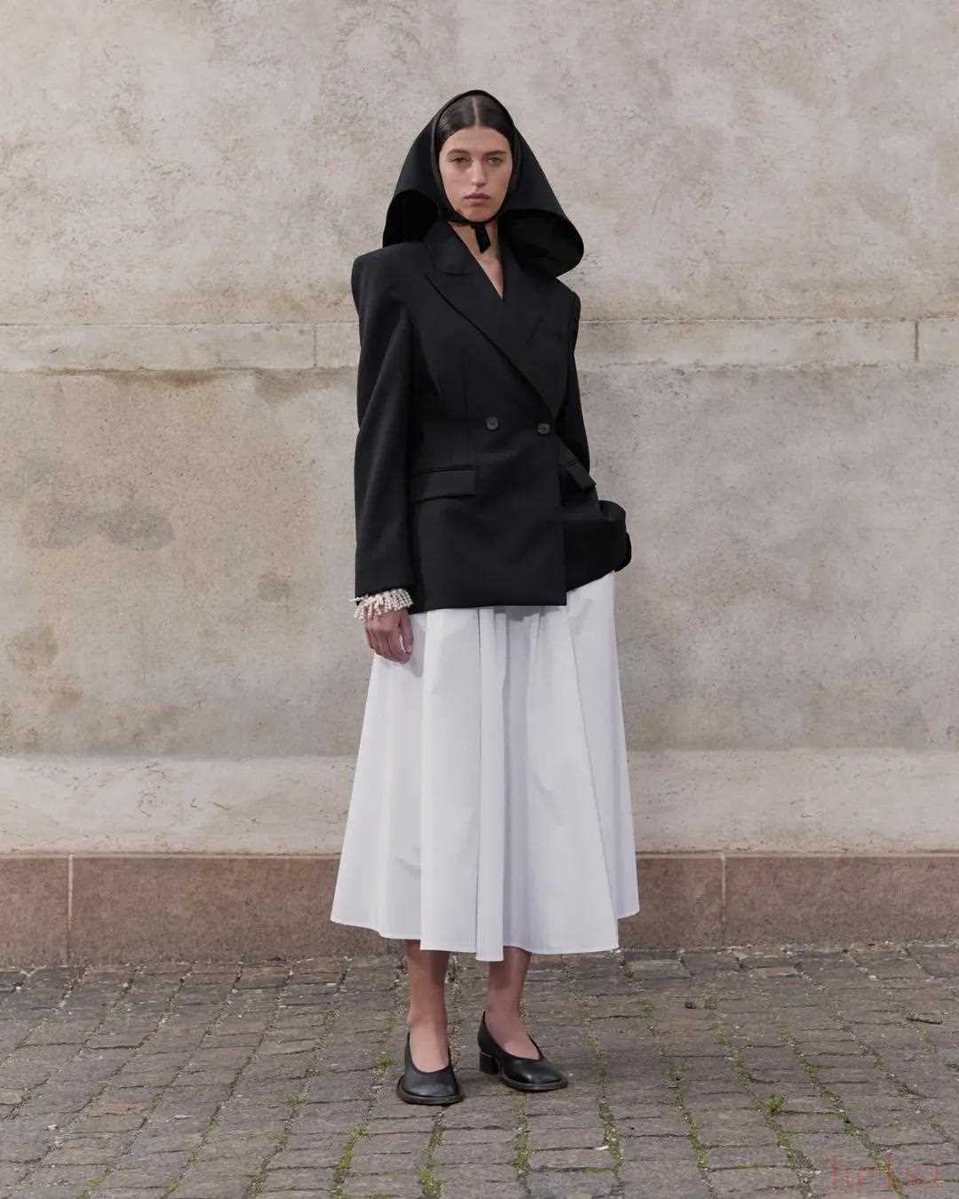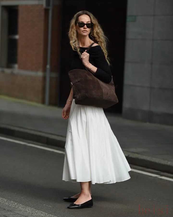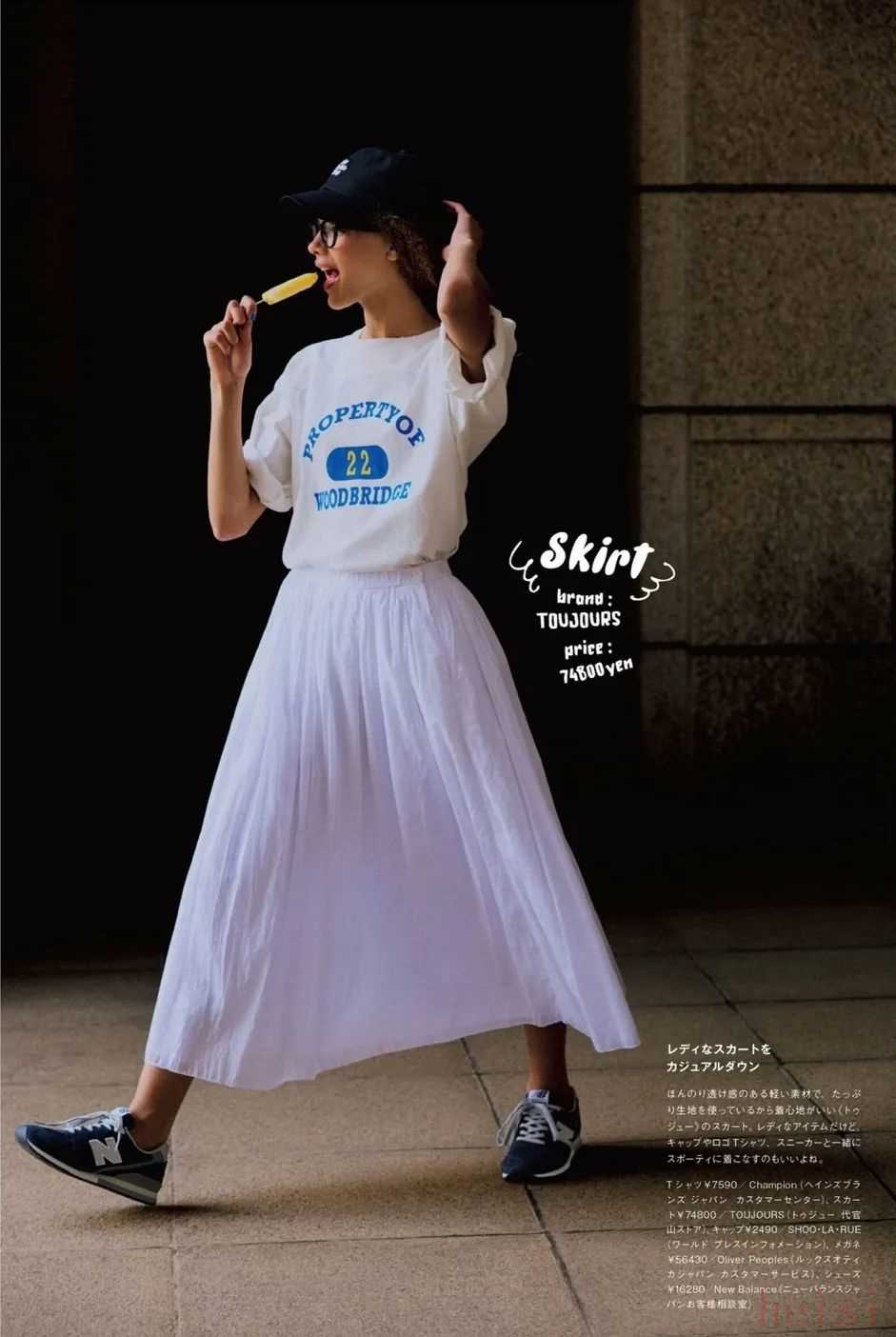 這兩年火的幾乎都是同一種類型,就是下圖中間這條——寬松的小A版型、設(shè)計(jì)簡(jiǎn)約的白色過膝裙,它比牛仔裙輕盈,又比緞面裙更休閑。▼