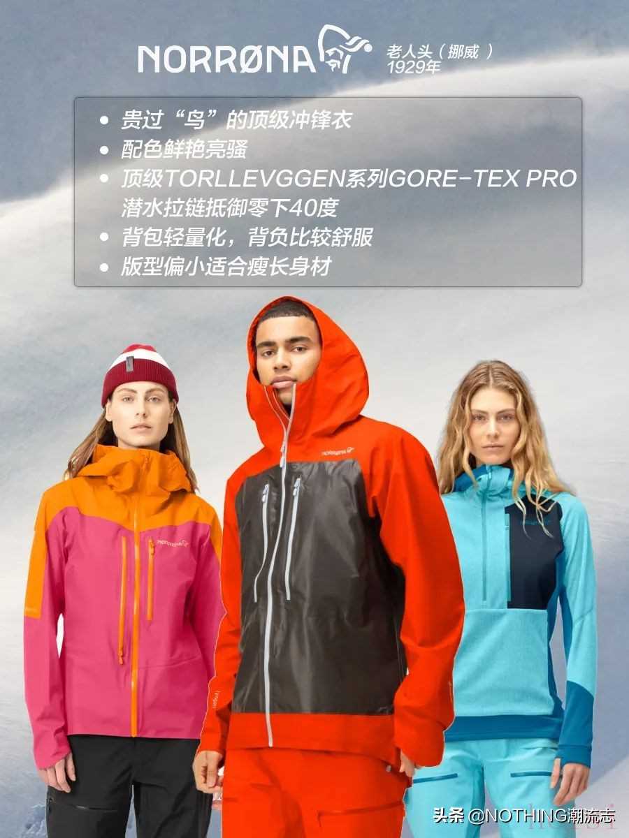 1929年建立的老人頭頂著沖鋒衣第一品牌的名頭叱咤戶外圈,高出鳥大幾千的價格令人望其項背,用料和做工外加配色是NORRONA的特點,拉鏈拉頭,風繩處,雪裙按釘都有老人頭標識,做工精細,細節(jié)到位!