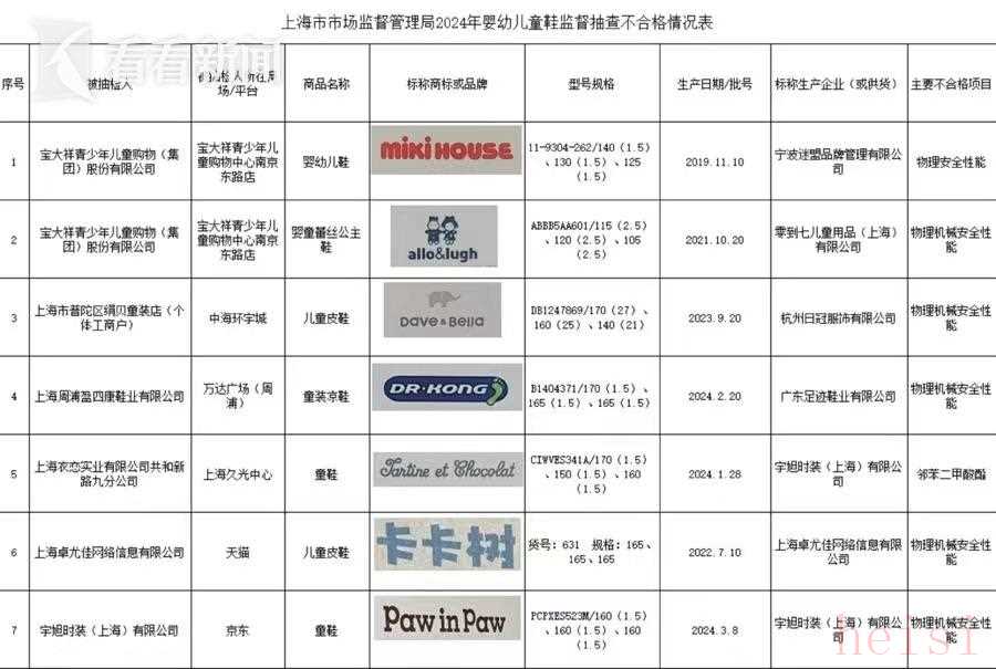 近期,上海市市場監(jiān)管局集中組織力量對閔行、黃浦、長寧、普陀、靜安、浦東新區(qū)6個區(qū)以及京東、天貓2家網(wǎng)絡平臺37家企業(yè)銷售的40個品牌40批次嬰幼兒童鞋進行了監(jiān)督抽查。經(jīng)檢測,有7批次不合格,不合格檢出率為17.5%。
