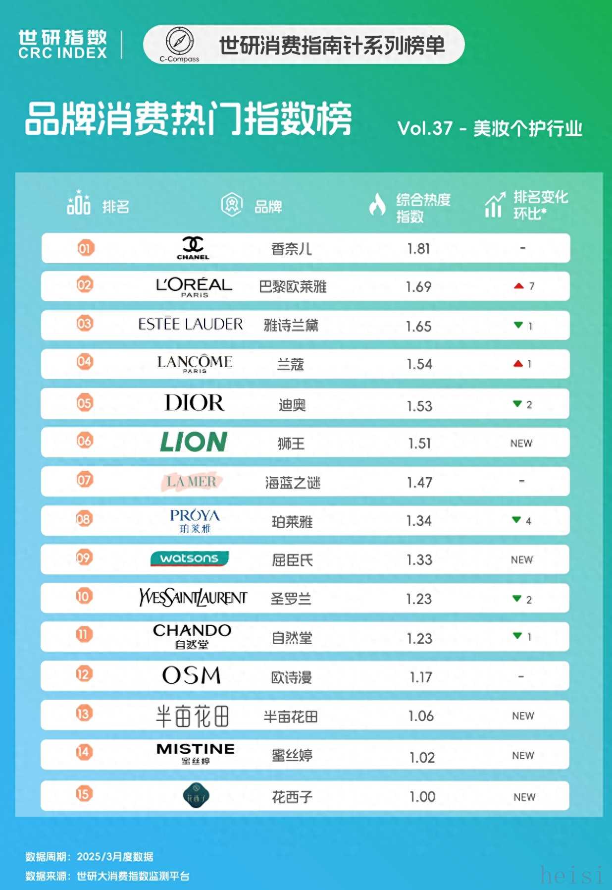 本次監(jiān)測(cè)周期內(nèi),美妝護(hù)膚品牌香奈兒、巴黎歐萊雅和雅詩(shī)蘭黛分別以1.81、1.69、1.65的綜合熱度位列榜單綜合熱度前三。