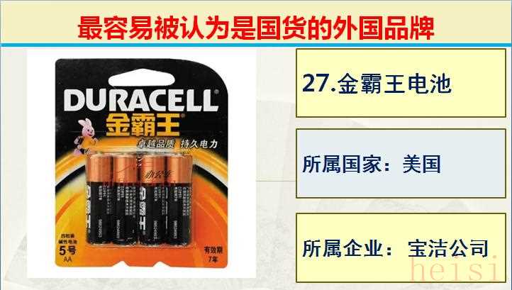 27.品牌:金霸王電池; 所屬國(guó)家:美國(guó); 所屬企業(yè): 寶潔公司。
