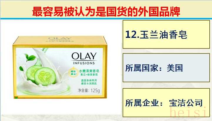 12.品牌:玉蘭油香皂; 所屬國(guó)家:美國(guó); 所屬企業(yè): 寶潔公司。
