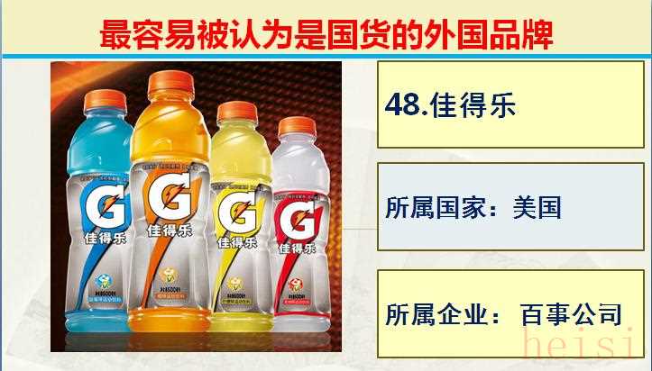 48.品牌:佳得樂 ; 所屬國(guó)家:美國(guó); 所屬企業(yè):百事公司。