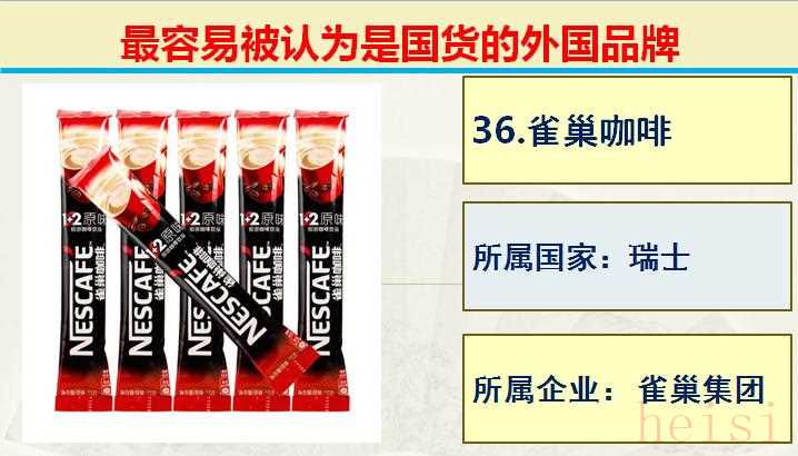 36.品牌:雀巢咖啡 ; 所屬國(guó)家:瑞士 ; 所屬企業(yè): 雀巢集團(tuán)。