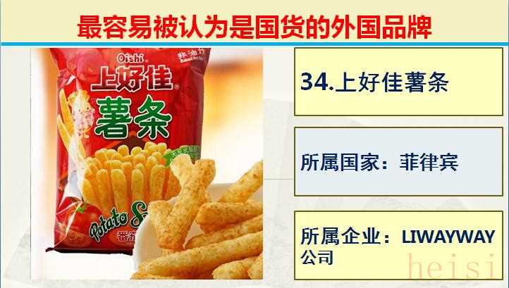 34.品牌:上好佳薯?xiàng)l ; 所屬國(guó)家:菲律賓 ; 所屬企業(yè): LIWAYWAY 公司。