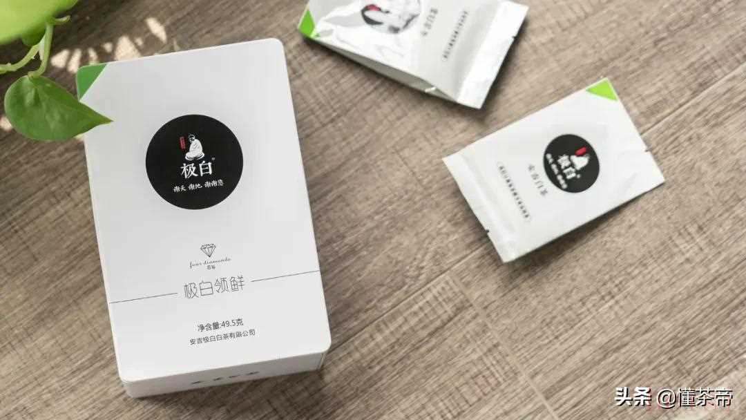 極白的這款雨前特級盒裝,規(guī)格是49.5g,網(wǎng)上售價66元,比宋茗的安吉白茶略貴。包裝上,外包裝是鐵盒,內(nèi)包裝是15個小泡袋。