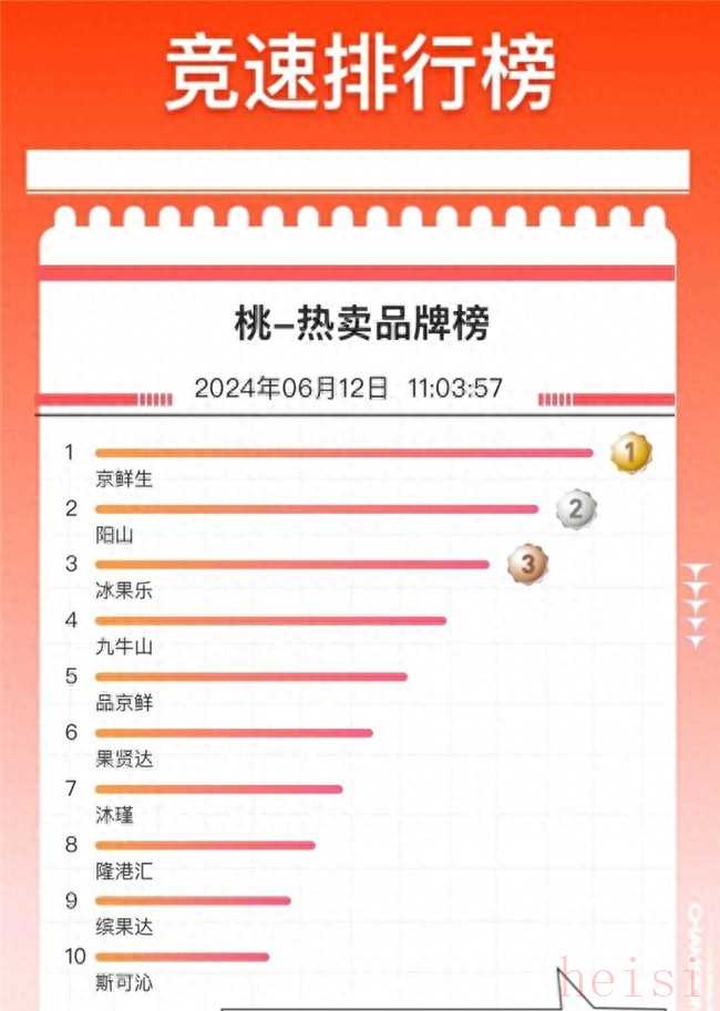 鮮桃作為夏季的時(shí)令水果,深受消費(fèi)者喜愛。在京東超市618期間,桃類產(chǎn)品的銷售情況尤為搶眼。根據(jù)最新的競速榜數(shù)據(jù),京鮮生、陽山、冰果樂等10大品牌憑借其高品質(zhì)和良好口碑,成功上榜。