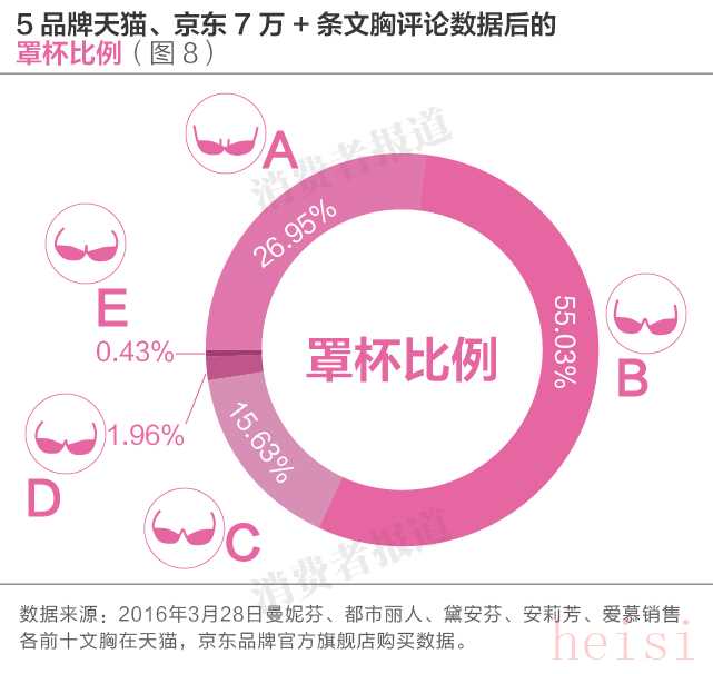 《消費(fèi)者報道》試圖以小見大,通過在曼妮芬、都市麗人、黛安芬、安莉芳、愛慕五品牌在天貓,京東的官方旗艦店七萬多條購買數(shù)據(jù),分析女性對文胸的“色”取向和罩杯大小。