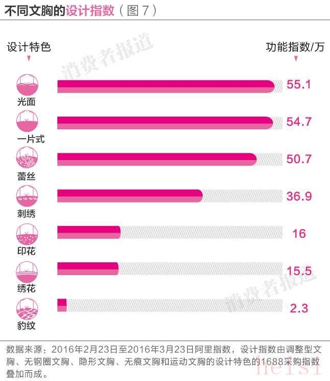 而在設(shè)計(jì)特色上,光面、一片式和蕾絲文胸是消費(fèi)市場一線梯隊(duì)。(如圖7)