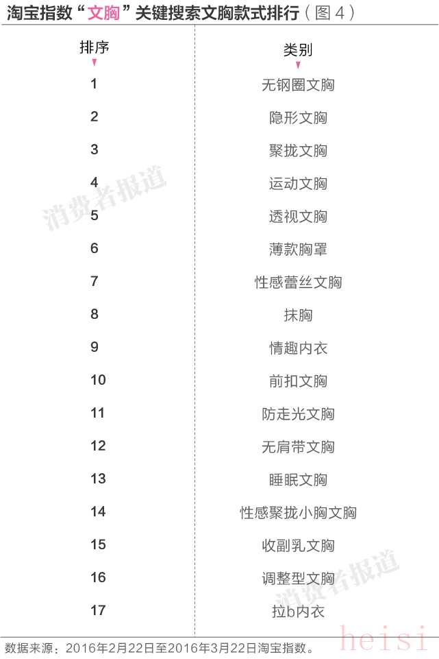 2016年3月淘寶指數(shù)顯示,“無鋼圈文胸”一直是“文胸”相關(guān)的關(guān)鍵搜索詞中排位最高的文胸類型,其次是隱形文胸,第三才是和鋼圈矯正相關(guān)度較大的聚攏文胸。(如圖4)