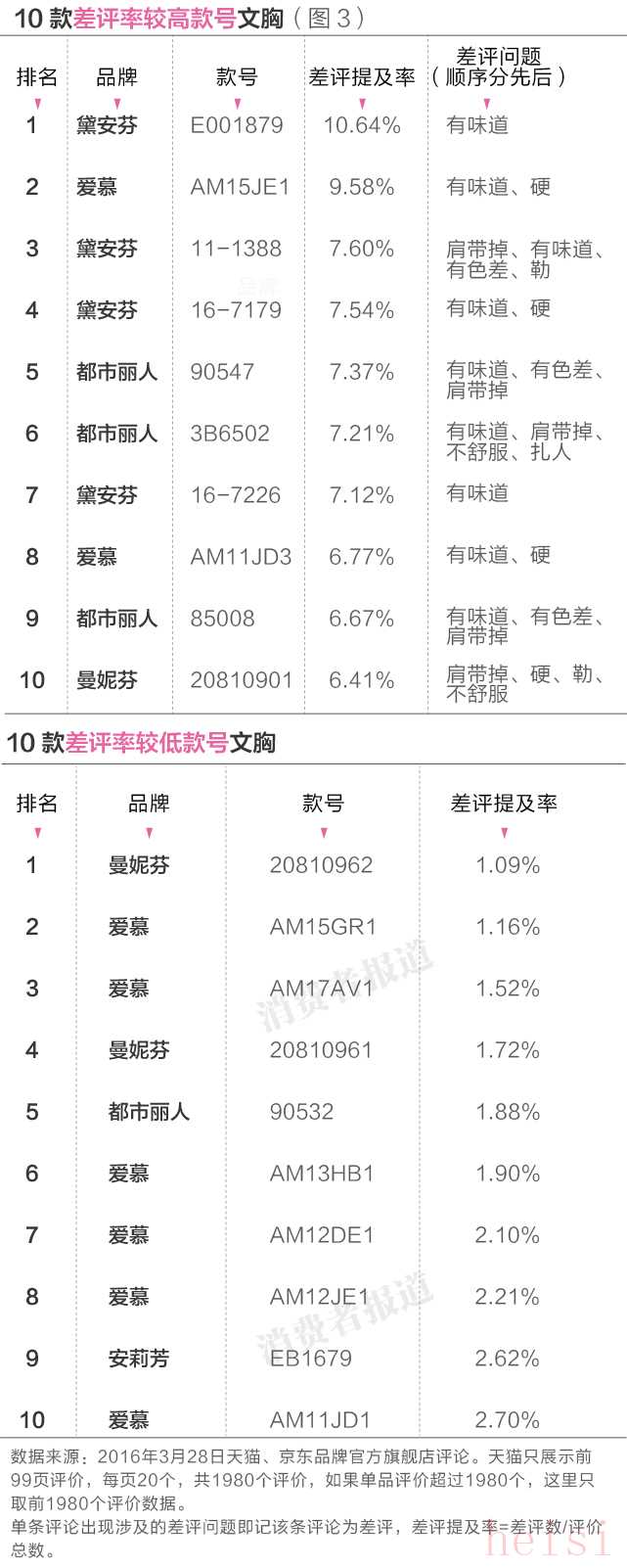 除了整體品牌之外,具體型號的槽點(diǎn)也不盡相同。本刊列出了此次對比的84款文胸中差評占比較高的和較低的十款文胸,供消費(fèi)者具體參考。(如圖3)
