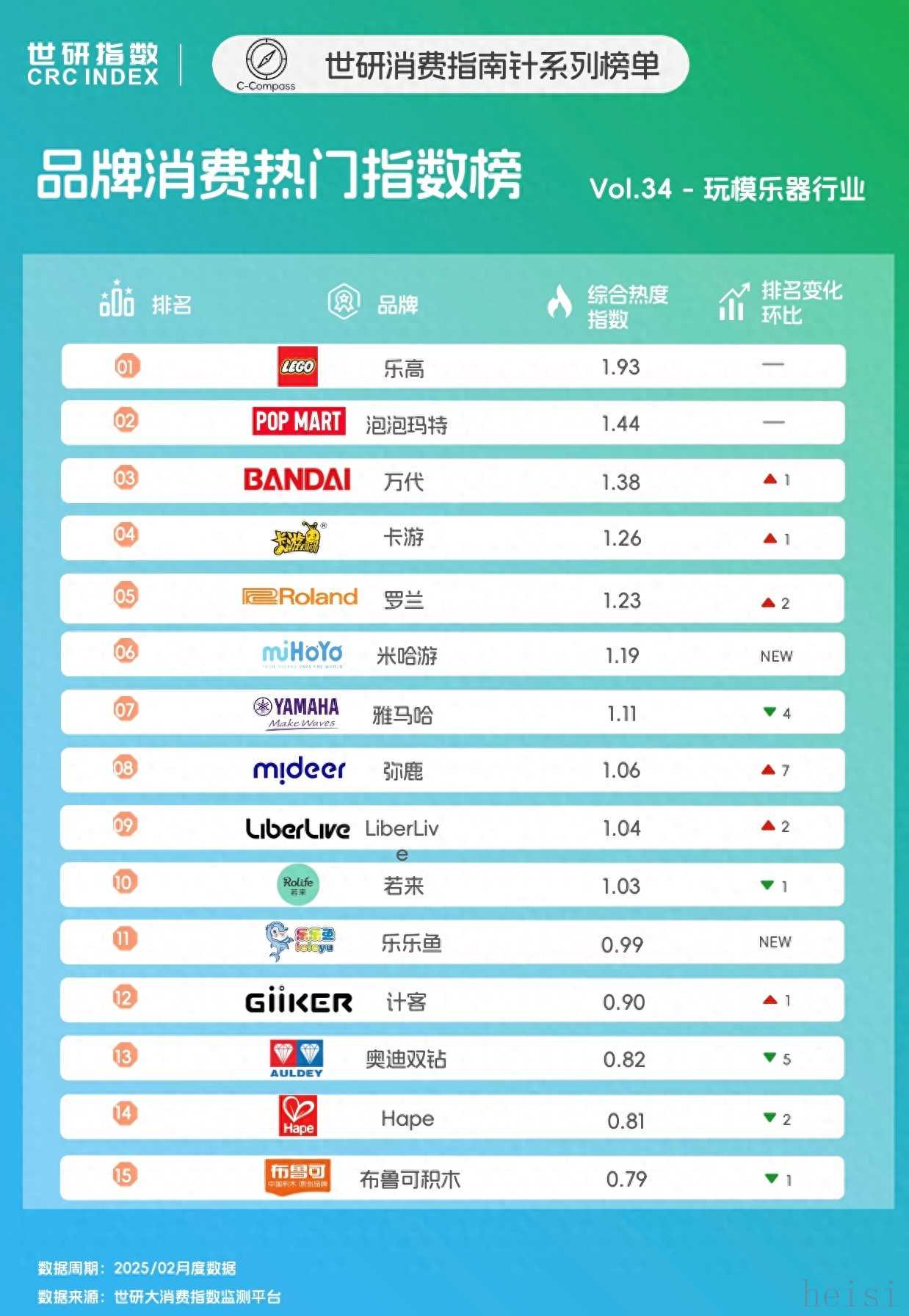 本次監(jiān)測周期內(nèi),樂高、泡泡瑪特和萬代分別以1.93、1.44和1.38的綜合熱度位列榜單前三名。