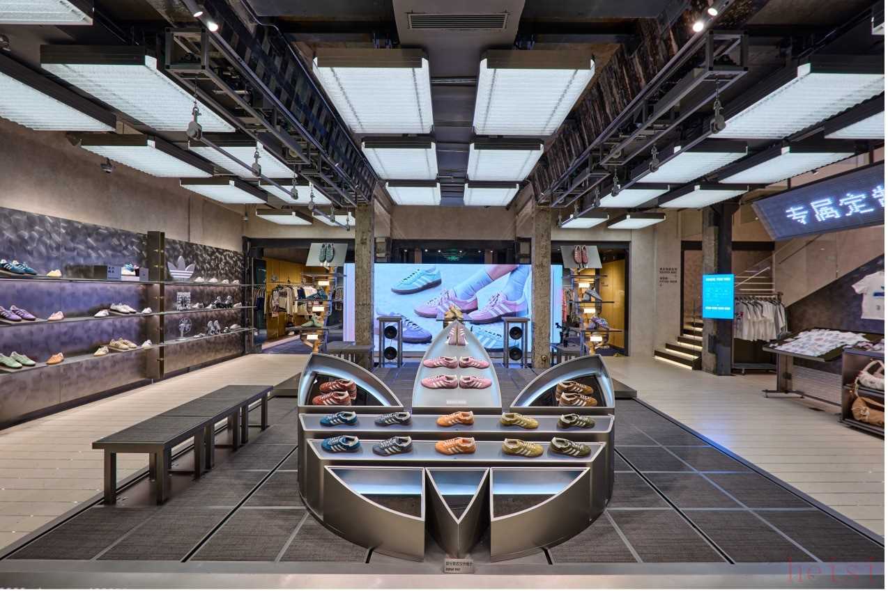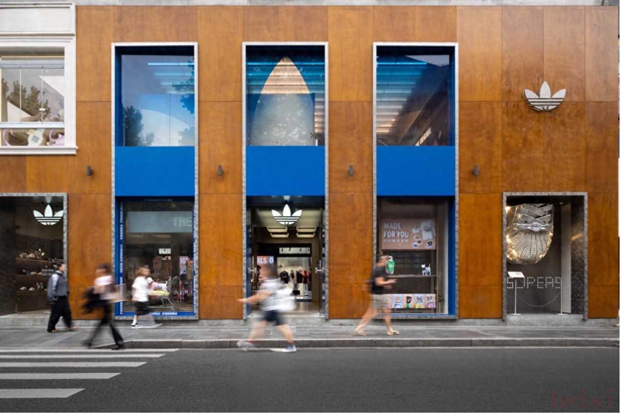 該旗艦店建筑的前身是電影院永樂(lè)宮,為此,品牌在門店外立面設(shè)計(jì)上保留了不少原址的特色,融合了影院美學(xué)和海派文化,在保留原有的建筑結(jié)構(gòu)和外立面木飾面的基礎(chǔ)上將經(jīng)典三條紋和三葉草logo融入其中,并通過(guò)三個(gè)不同的櫥窗展示產(chǎn)品。