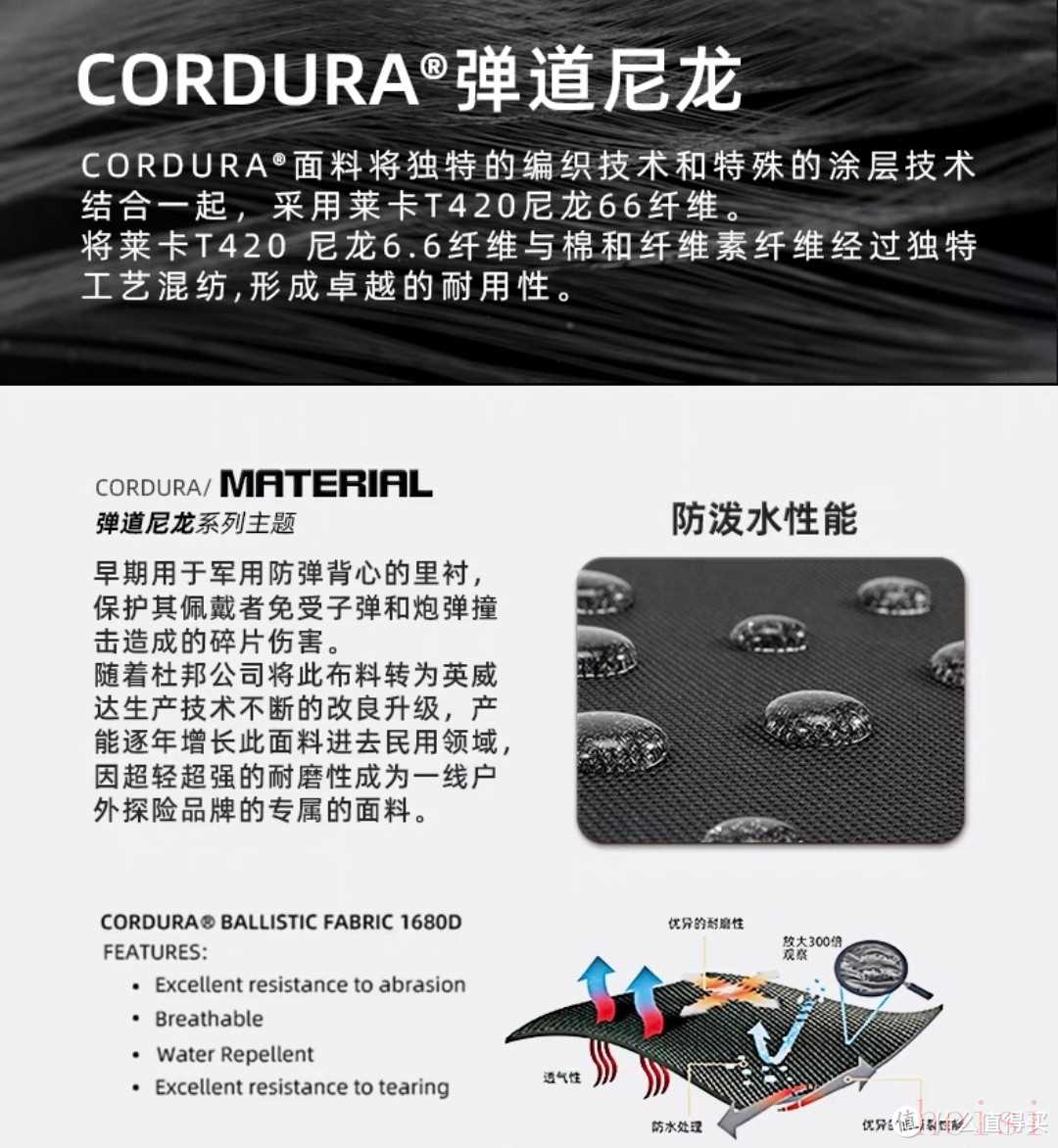 彈道尼龍可以說是我最愛的材質(zhì),Ballistic Nylon這種面料是二戰(zhàn)時杜邦公司為美軍開發(fā)的飛行員防彈夾克的面料,以前的譯名就叫防彈尼龍,最開始主要用于保護飛行員不被彈片劃傷。原理說起來很簡單,就是用一堆既堅固又耐磨還抗撕裂的尼龍纖維,用特殊方法編織、涂層后,就可以起到強大的防護作用。用彈道尼龍來做背包那簡直就是降維打擊,它可以提供高韌性、高耐磨性的背包表面用材料,而且彈道尼龍的抗拉強度、抗沖擊性和抗穿刺性都非常出色,能夠有效地防護子彈和碎片的沖擊。