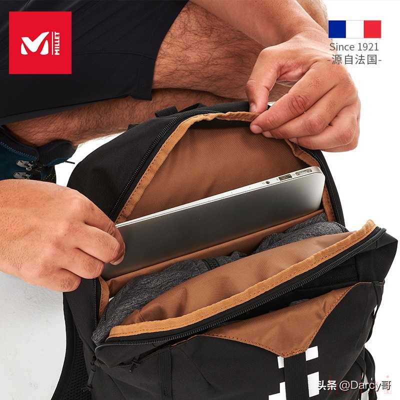 該款電腦背包容量為18L,采用北極狐引以為傲自主研發(fā)的科技面料G-1000。G-1000面料采用65%的聚酯纖維和35%的有機棉紗密制混紡而成,強韌耐磨;同時可以借助GREENLAND WAX(格陵蘭蠟)調(diào)整防水和透氣性能,讓背包歷久彌新。KANKEN NO.2 LAPTOP可以輕松裝下15寸以下的筆記本電腦,包內(nèi)有單獨的電腦倉,并且設(shè)置了雙面加厚軟墊,可以有效減震,更好的保護電腦。6、MILLET覓樂城市通勤休閑旅行包電腦雙肩背包可拆卸腰胸帶MIS2237