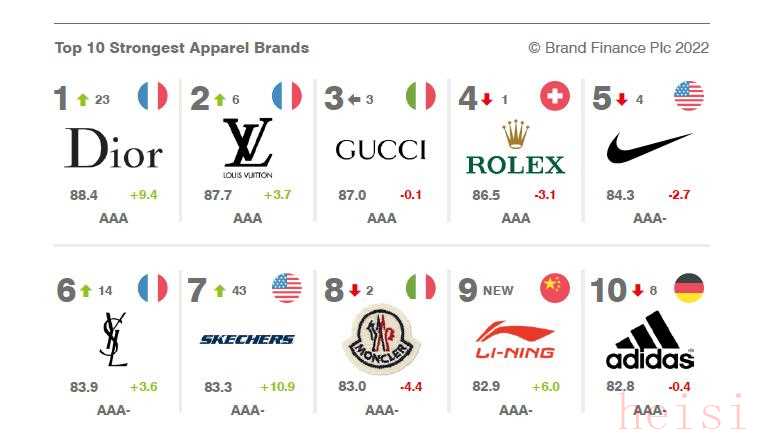 在Dior、LV等奢侈品牌的包圍下,運動品牌占據(jù)四個席位,耐克、斯凱奇、李寧和阿迪達(dá)斯分別排名第5、第7、第9和第10名。