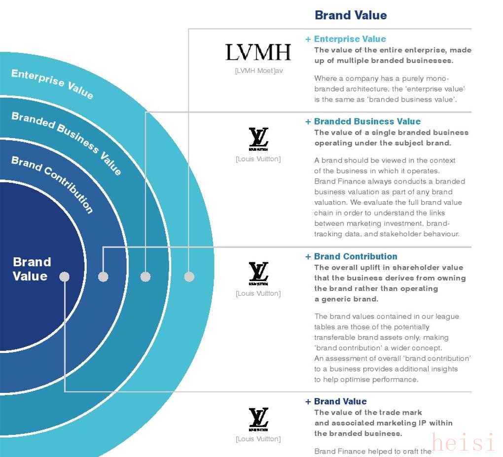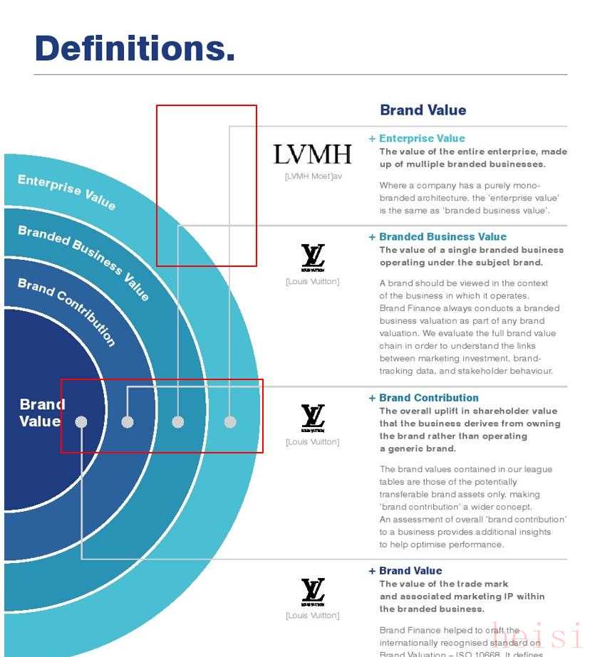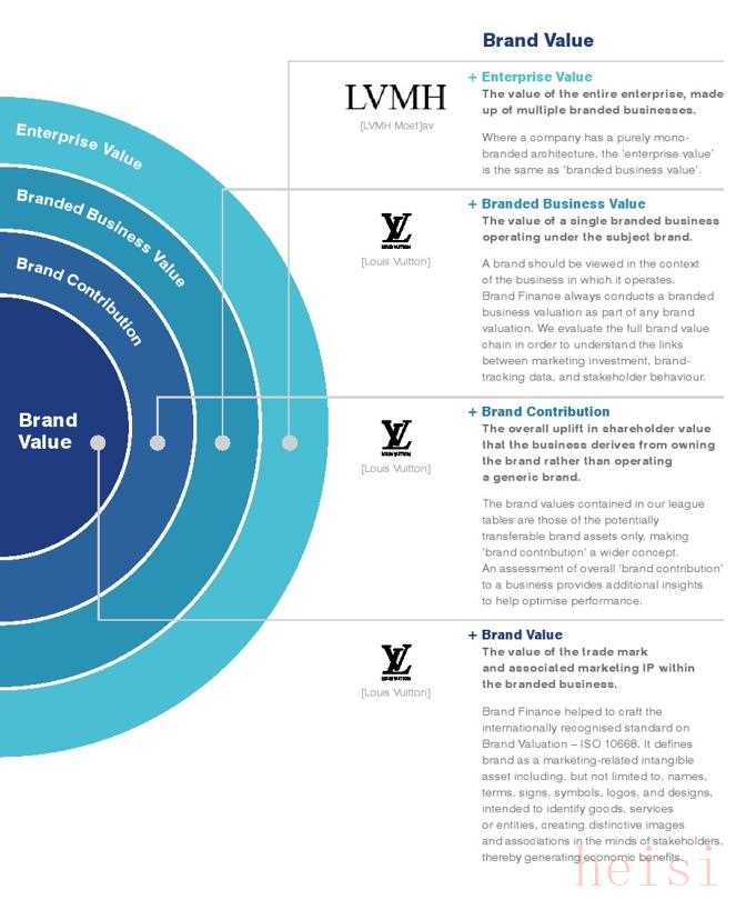 其中圓環(huán)最中間是品牌價(jià)值,其它三層是品牌貢獻(xiàn)、品牌商業(yè)價(jià)值和企業(yè)價(jià)值: