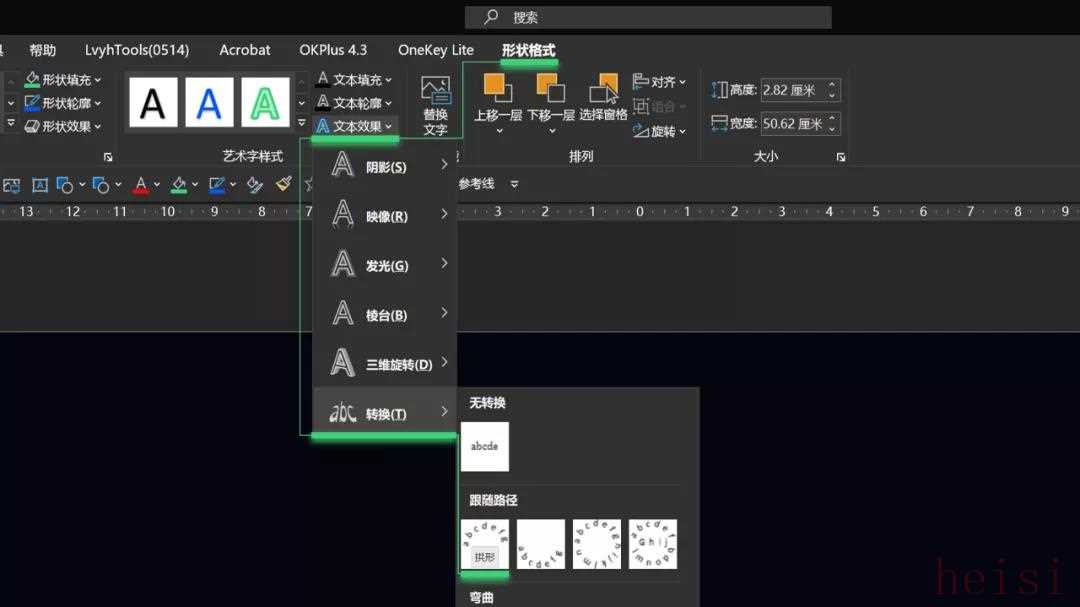 選中這一行文本后,依次點(diǎn)擊 形狀格式 > 文本效果 > 轉(zhuǎn)換 > 跟隨路徑 > 拱形: