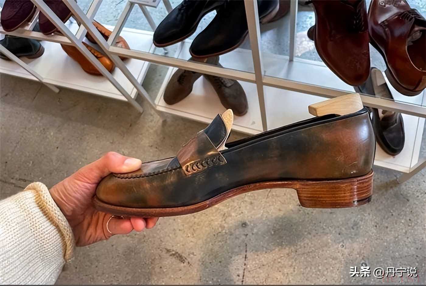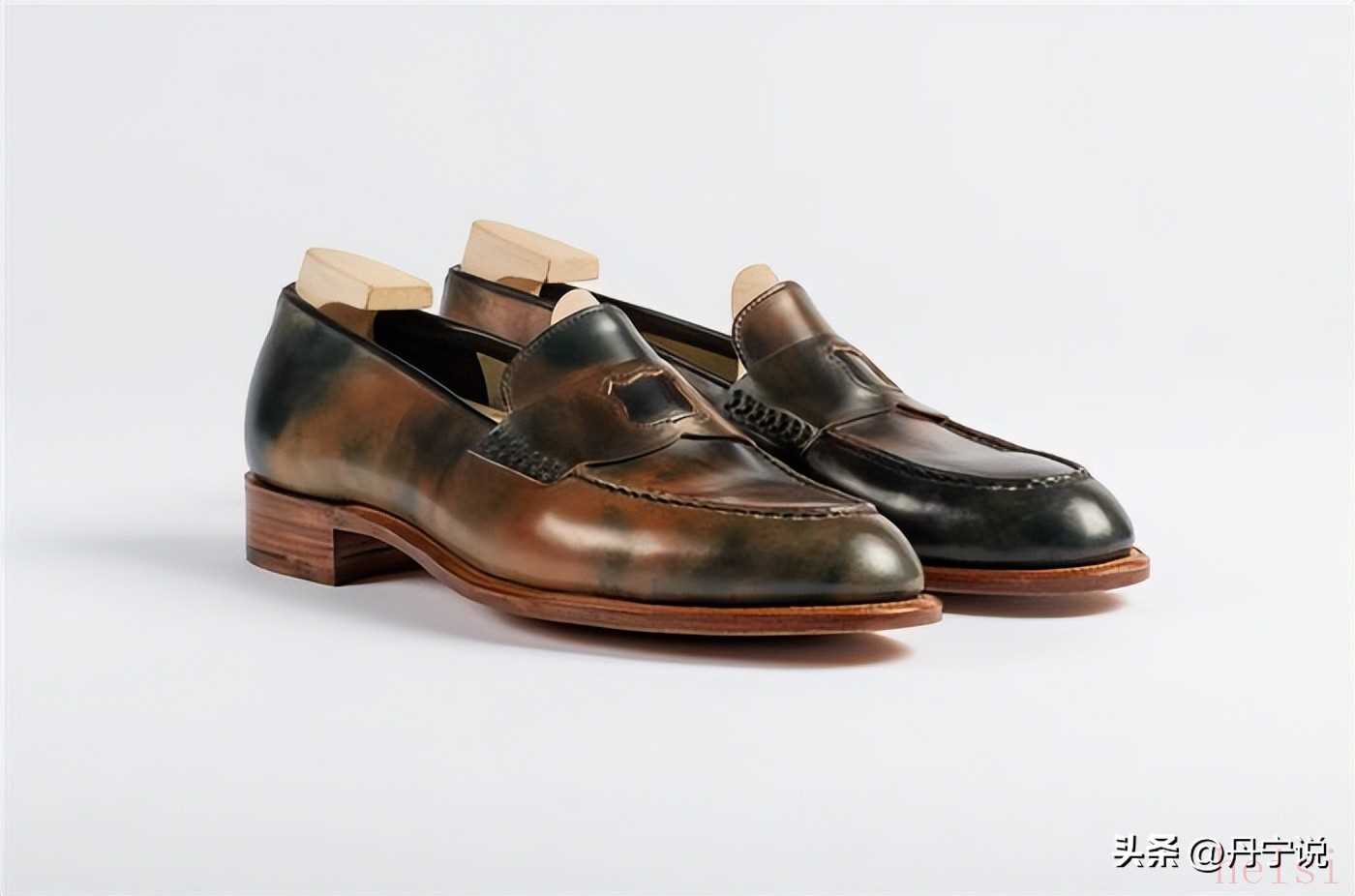 Penny loafer鞋是近200年來主流時尚產(chǎn)品,能展示E. Woodford技藝的一個單品。它擁有奢侈黑色大理石外觀。皮料來自Horween,工藝繁瑣,先將一層黑色染料涂在曬黑的水牛皮革上,然后刮去等一系列復(fù)雜流程,最終才能產(chǎn)生燒焦琥珀和青綠色山脈的大理石效果。表面上是一雙非常低跟或平底休閑鞋,但也適合在正式的商務(wù)場合穿著哦。
