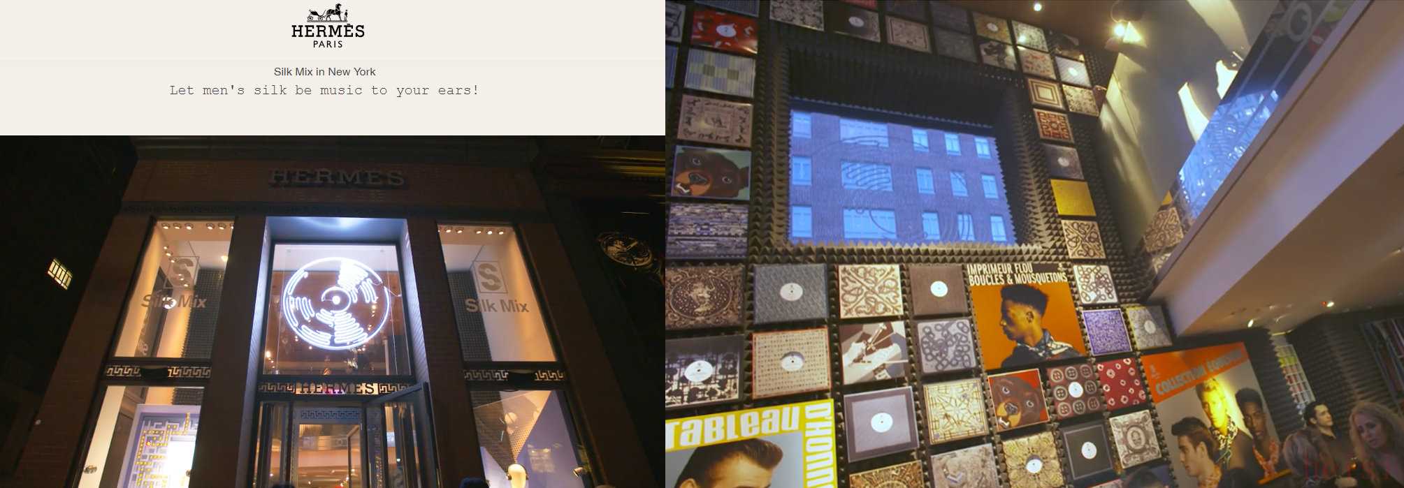2018至2019年 Hermès(愛馬仕)在美國紐約、德國慕尼黑等地開設(shè)了“Hermès Silk Mix”快閃店。店內(nèi)整墻以 Hermès 的絲巾和黑膠唱片為裝飾,游客們可以在這里暢聽黑膠唱片。Hermès 用唱片針劃過黑膠碟的觸感來比喻品牌標(biāo)志性的絲巾產(chǎn)品。