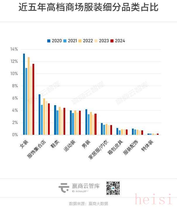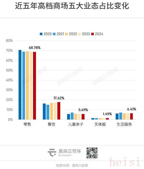 近五年,高檔商場(chǎng)零售業(yè)態(tài)占比從70.59%降至68.78%,減少近2個(gè)百分點(diǎn)。