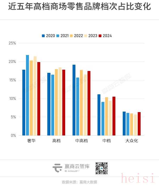 多輪洗牌后,高檔商場(chǎng)女裝品牌整體檔次較2020年明顯抬升,中檔、中高檔、高檔品牌均有不同程度收縮,而奢華品牌則在擴(kuò)張,印證時(shí)下消費(fèi)分層趨勢(shì)。