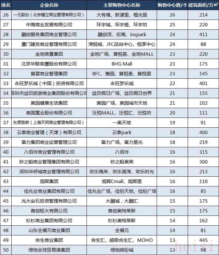 合生商業(yè)集團(tuán)排名第49位,綠地全球貿(mào)易港集團(tuán)排名第50位,月星集團(tuán)有限公司排名第51位;