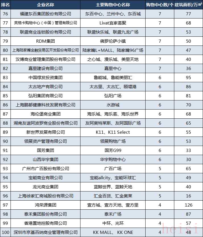 根據(jù)您提供的信息,以下是2023年中國(guó)購(gòu)物中心企業(yè)100強(qiáng)的排名情況: