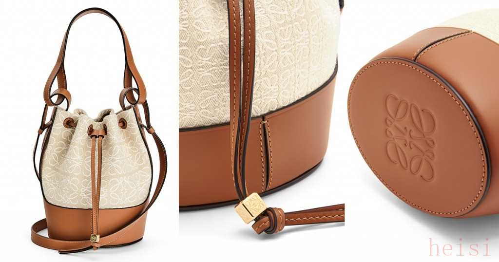 LOEWE 這款帆布小牛皮名牌手袋,以水桶造型為設計,帆布面是Monogram圖案,造工精致,包包最底面更有標志性的大Logo。