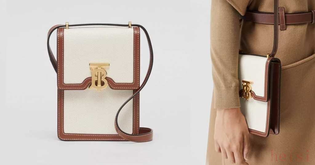 另一款簡約設計的帆布小牛皮名牌手袋,外型小巧,設有品牌標志性的金屬扣飾,非常獨特。