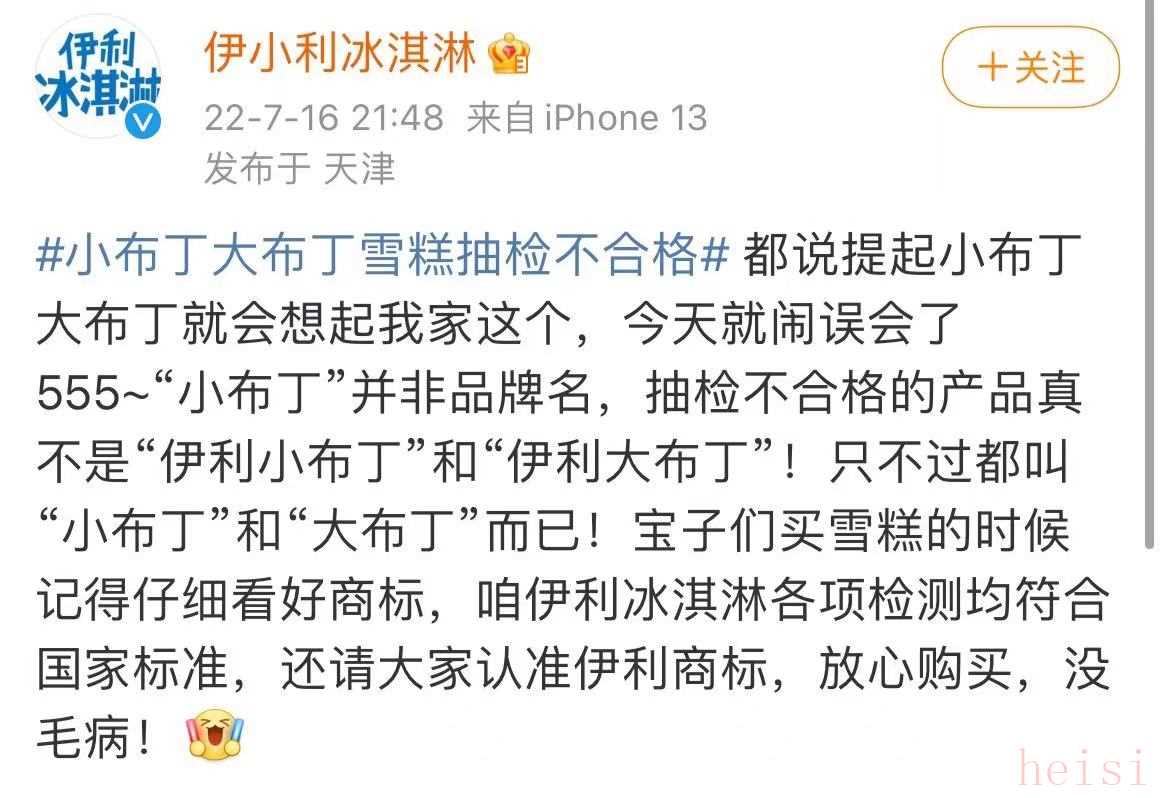7月16日晚,伊利微博回應(yīng)稱抽檢不合格的產(chǎn)品不是自家品牌的小布?。骸爸徊贿^都叫小布丁而已,伊利冰淇淋各項檢測均符合國家標(biāo)準(zhǔn)?!贝送?,伊利還溫馨提醒,請大家認準(zhǔn)伊利商標(biāo)放心購買。