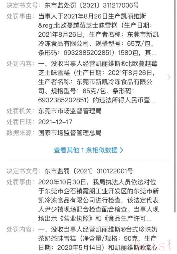 此外,仔細觀察市場監(jiān)管總局發(fā)布的信息,監(jiān)督抽檢不合格小布丁標(biāo)識企業(yè)為“東莞市新凱冷凍食品有限公司”,大布丁標(biāo)識企業(yè)為“義烏市樂久冷凍食品有限公司”,并非伊利小布丁生產(chǎn)公司。此前,東莞市新凱冷凍食品有限公司生產(chǎn)的北歐蔓越莓芝士雪糕、凱麗維斯臺式珍珠奶茶味雪糕也因蛋白質(zhì)項目不合格而被行政處罰。