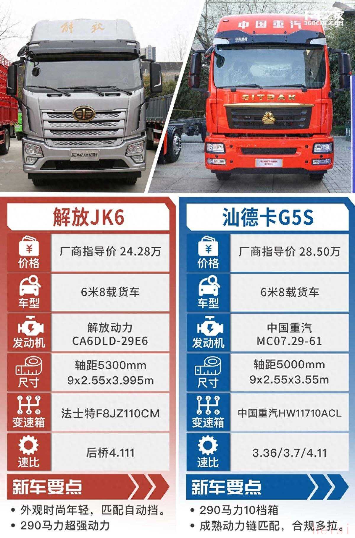 【卡車之家 原創(chuàng)】作為人民生產(chǎn)生活中不可或缺的一環(huán),綠通運(yùn)輸一直在貨運(yùn)市場(chǎng)中占據(jù)著非常大的份額,最近在走訪經(jīng)銷商時(shí),卡車之家發(fā)現(xiàn)卡友們對(duì)裝配有AMT的6米8運(yùn)輸車輛非常感興趣。本期卡車之家為卡友們帶來了兩款大馬力自動(dòng)檔6米8車型,他們分別是汕德卡G5S以及解放JK6,作為載貨車中的高配選手,這兩臺(tái)車在駕乘舒適性方面有什么區(qū)別,底盤配置誰更勝一籌呢?咱們一起盤一盤。