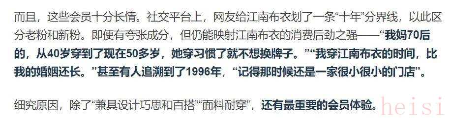 我們?cè)诰W(wǎng)上、在現(xiàn)實(shí)生活里不難聽(tīng)到消費(fèi)者的真心話,他們是這樣說(shuō)的:“我媽是70后,從40歲穿到了現(xiàn)在50多歲?!薄拔掖┙喜家碌臅r(shí)間,比我的婚姻還長(zhǎng)。”還有人追溯到了1996年,“那時(shí)候(江南布衣)還是一家很小很小的門(mén)店”。