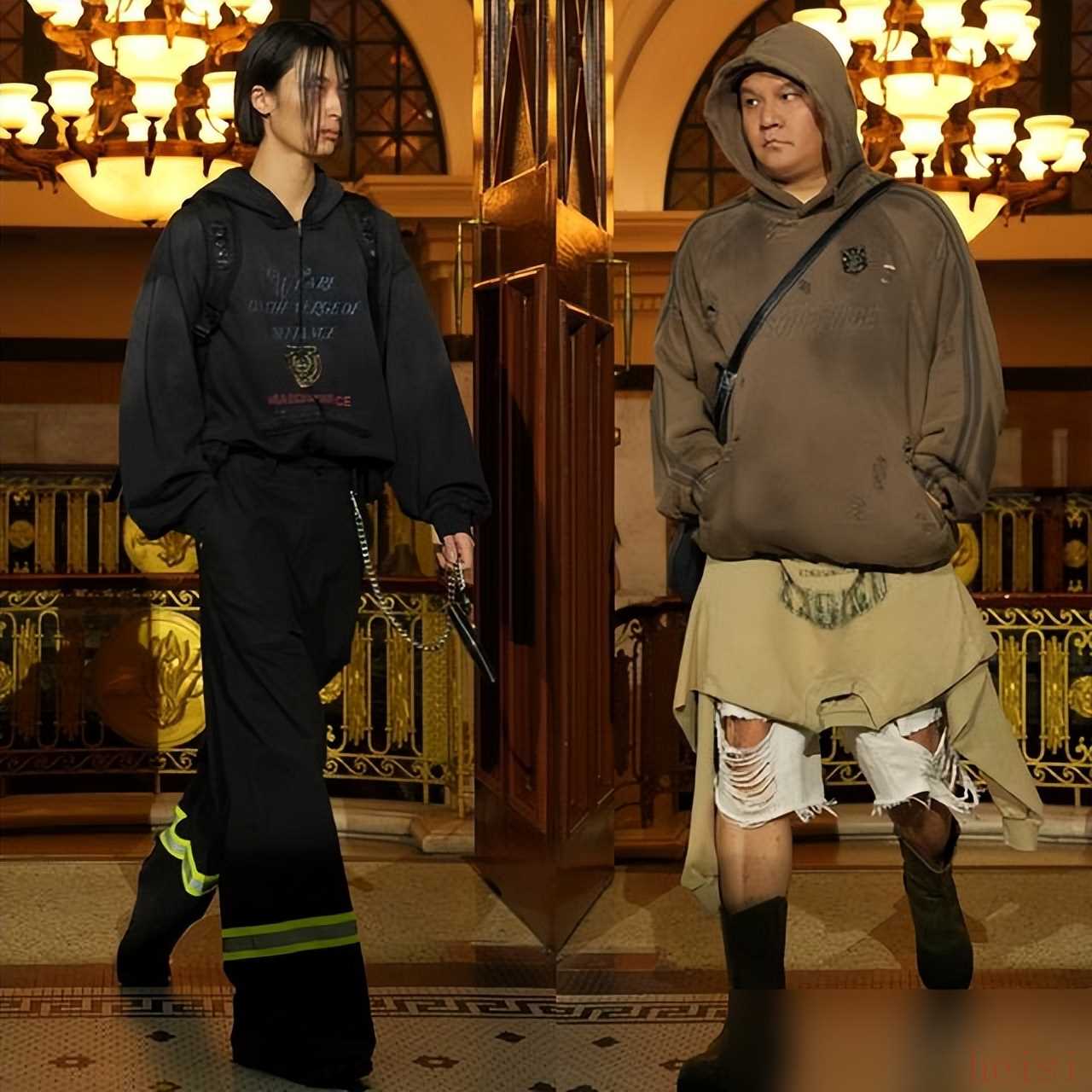 再說(shuō)說(shuō)masonprince,這牌子我第一次見(jiàn)是在東山口,有個(gè)小伙子穿了件廓形衛(wèi)衣配闊腿褲,遠(yuǎn)看像從秀場(chǎng)直接走下來(lái)的,近看才發(fā)現(xiàn)口袋是漸變玻璃材質(zhì)的,衣角還掛著金屬鏈條——這哪是衣服,簡(jiǎn)直是行走的藝術(shù)裝置。