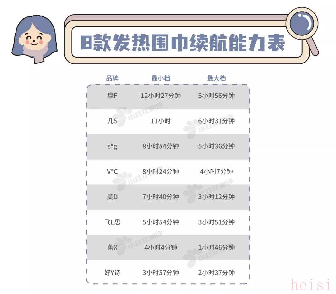 2、s*g的重量最輕,摩F、好Y詩(shī)、蕉X的重量較重。最重的蕉X、摩F、好Y詩(shī)圍在脖子上,能有明顯的負(fù)重感。其他款重量相差不大,使用時(shí)肩膀沒(méi)有明顯負(fù)重感。續(xù)航能力發(fā)熱圍巾由內(nèi)置的發(fā)熱片+充電寶,實(shí)現(xiàn)長(zhǎng)時(shí)間的發(fā)熱功能。如果冬天需要在戶外待較長(zhǎng)的時(shí)間,圍巾的續(xù)航能力就很重要了。花爸讓同事們實(shí)測(cè)了發(fā)熱圍巾最小檔、最大檔的續(xù)航能力。結(jié)果如下: