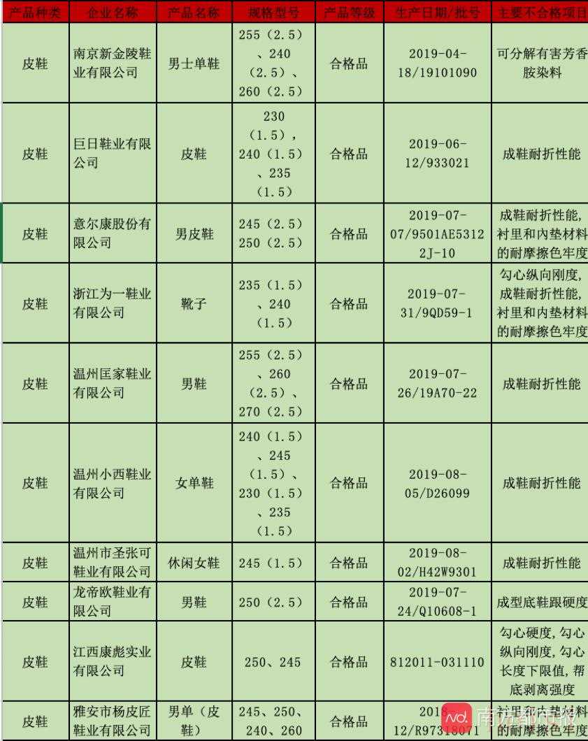 11月10日,市場監(jiān)管總局辦公廳發(fā)布關于2019年休閑服裝等77種產(chǎn)品質(zhì)量國家監(jiān)督抽查情況的通報,此次被抽檢不合格的皮鞋共有10批次,其中包括耳熟能詳?shù)钠放埔鉅柨档囊慌文惺科ばㄉa(chǎn)日期/批號