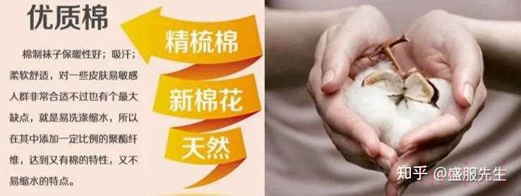 - 棉:一般人都會選擇純棉的襪子,不過市面上是找不到100%棉的襪子的,一般含棉量在75%以上的襪子就可以稱為“全棉襪”了,85%含棉量的襪子算是非常高檔的棉襪了,因為需要加入一些比如滌綸,氨綸,錦綸等功能性的纖維來保持襪子的彈性、牢度和舒適性。