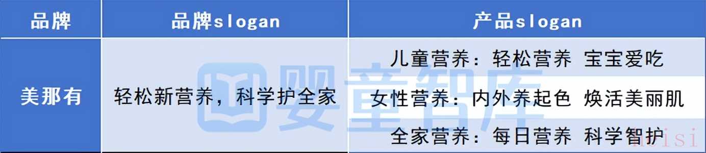 值得注意的是,雖然多數(shù)品牌在slogan中強調(diào)了其產(chǎn)品矩陣的全面性,但其旗下的大單品或明星產(chǎn)品則會更聚焦某一細分賽道和突出產(chǎn)品功效,從而完成不同產(chǎn)品定位的有效區(qū)隔。以美那有為例,針對兒童營養(yǎng)、女性營養(yǎng)和全家營養(yǎng),品牌也分別制定了不同口號。