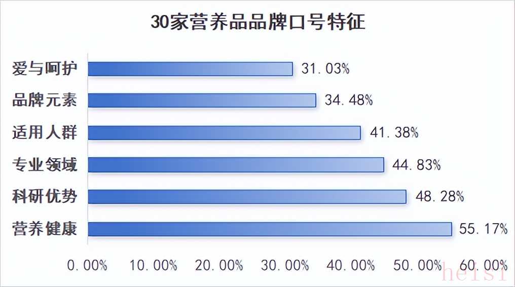 通過梳理發(fā)現(xiàn),聚焦于“營養(yǎng)健康”、“科研優(yōu)勢”、“專業(yè)領(lǐng)域”、“適用人群”、“品牌元素”、“愛與呵護”是營養(yǎng)品品牌口號最為青睞的5種表達。有將近半數(shù)的營養(yǎng)品企業(yè)在其品牌/產(chǎn)品slogan中強調(diào)“營養(yǎng)健康”、“科研優(yōu)勢”、“專業(yè)領(lǐng)域”三個維度,其中突出“營養(yǎng)健康”理念的占比最高。