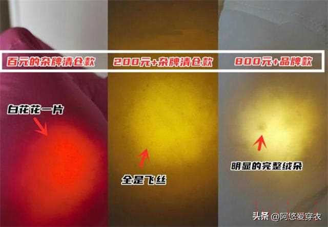 除了看標(biāo)簽,我們還可以通過觀察羽絨服的內(nèi)里來辨別其品質(zhì)。用燈光照射羽絨服的內(nèi)里,可以看到絨毛的形狀,優(yōu)質(zhì)的羽絨服,其絨毛形狀應(yīng)該是完整的,且大小一致的,呈現(xiàn)出整齊的條狀或塊狀。而劣質(zhì)的羽絨服,其絨毛形狀可能不清晰,或者是出現(xiàn)結(jié)塊、斷絨等現(xiàn)象。