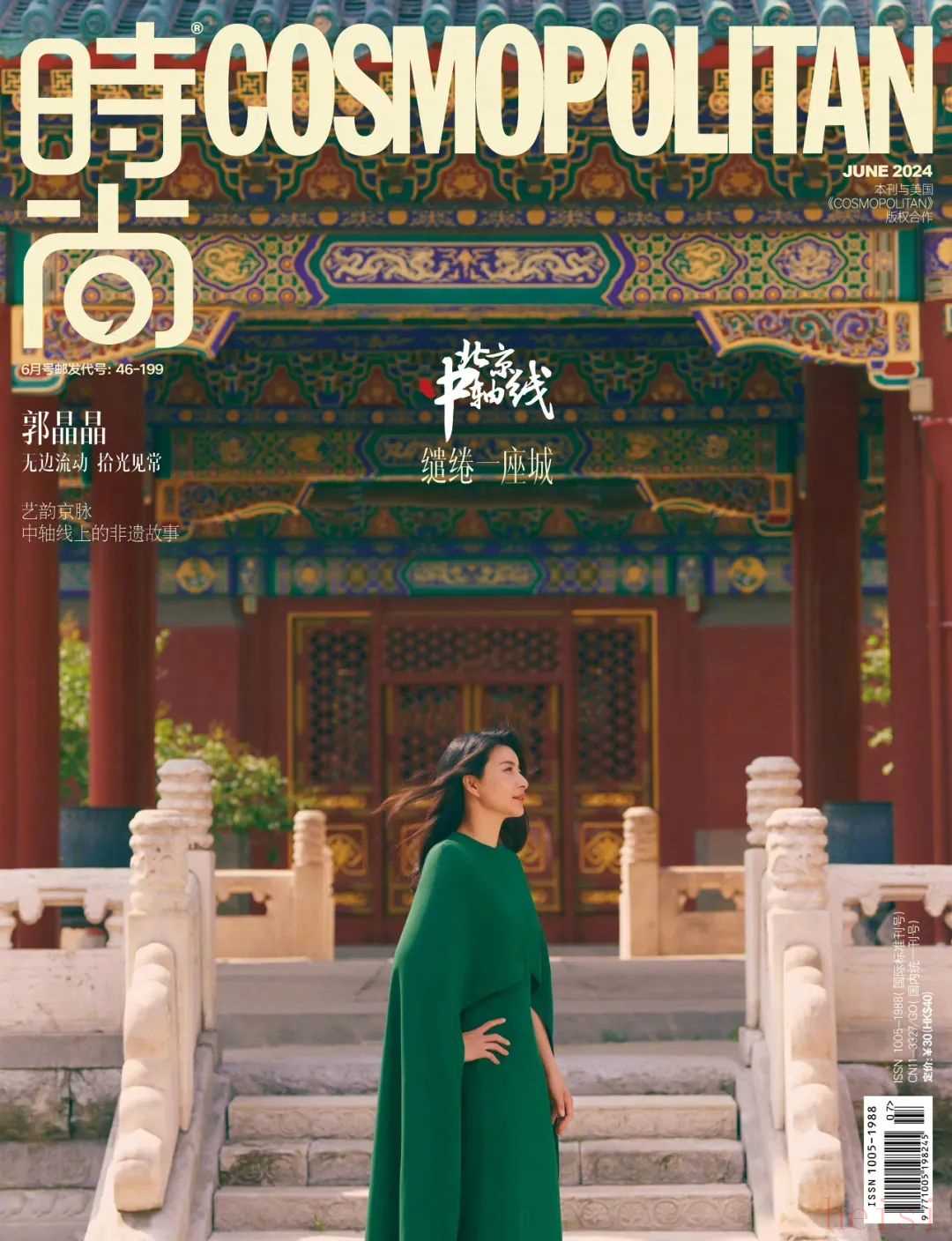 穿著綠色斗篷裙,亮相《時尚Cosmo》6月刊的封面,走在北京的中軸線路上。