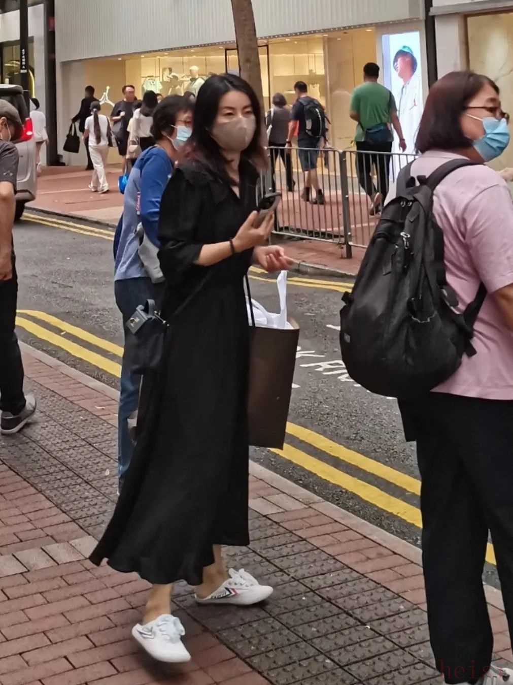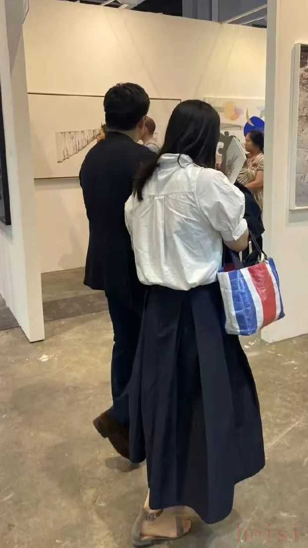 夫妻倆香港出街看展被偶遇,手里拎著十幾塊的帆布袋子。