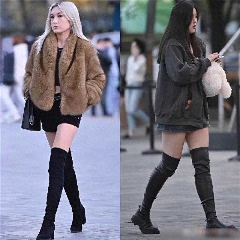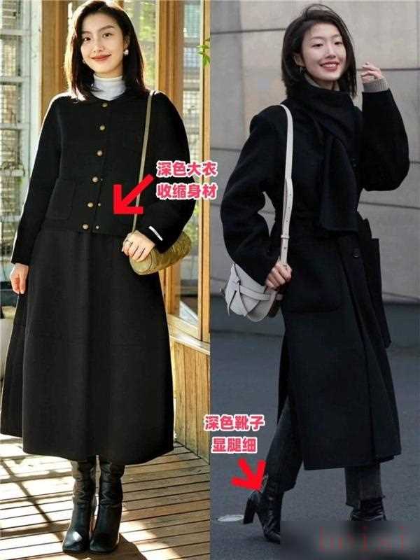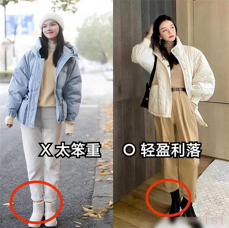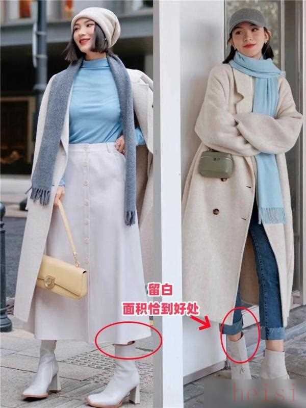 首先,冬季穿靴子要注意 上下的色彩搭配要呼應,一組下裝和靴子是同色系的,能起到顯瘦的效果。 但上淺下淺,鞋子和褲子融為一體,顯高效果更強。