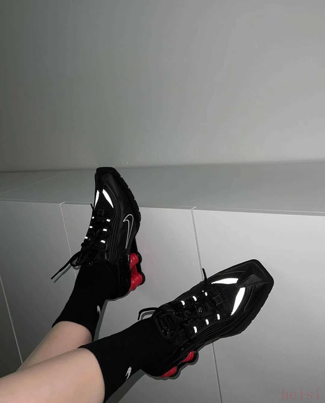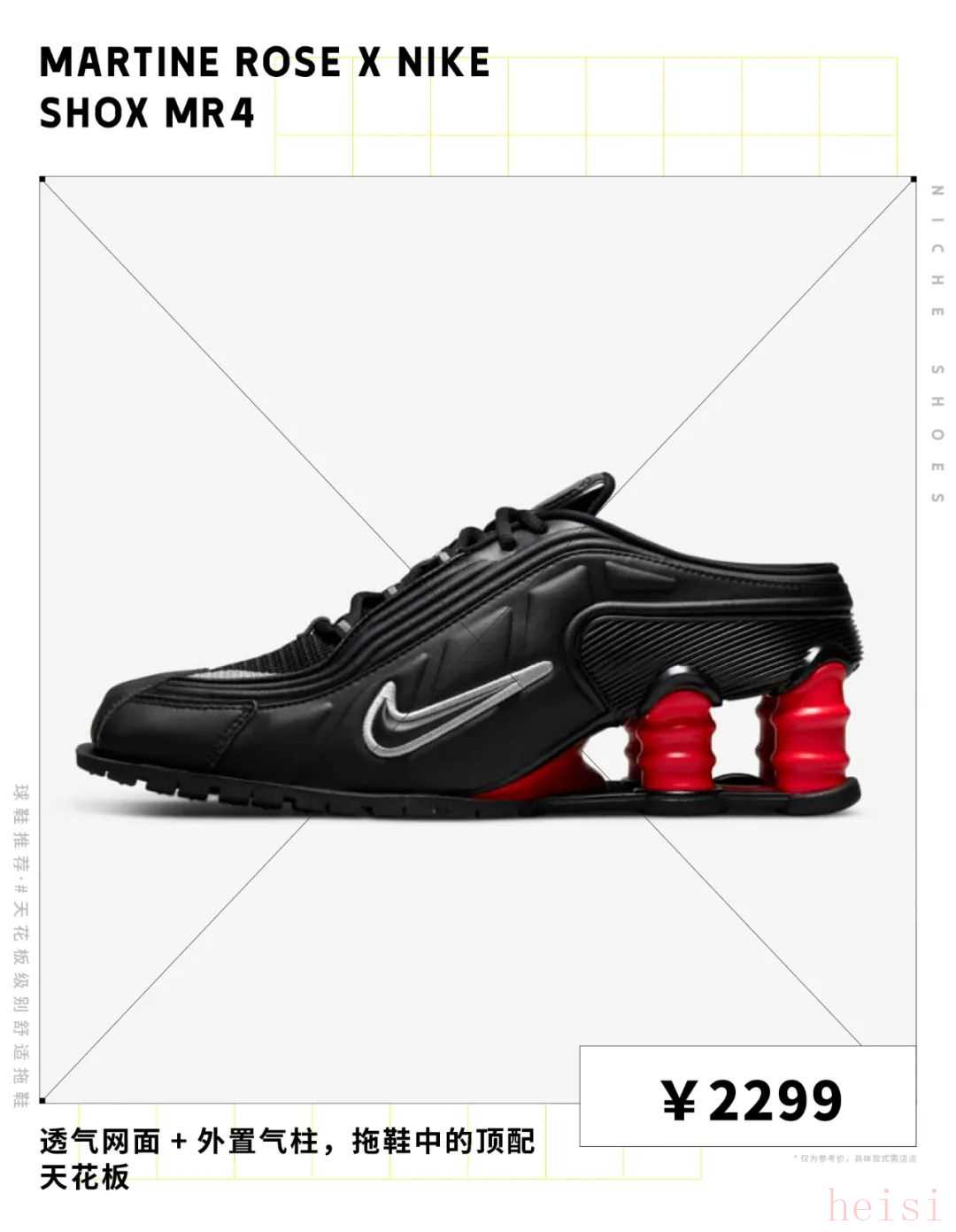 從名字上可以看出,Martine Rose x Nike Shox MR4的藍(lán)本原型就是Nike Shox R4,將鞋跟處的Shox氣柱模塊延長(zhǎng)加高,「海拔」方面更具備高跟鞋的形態(tài)。